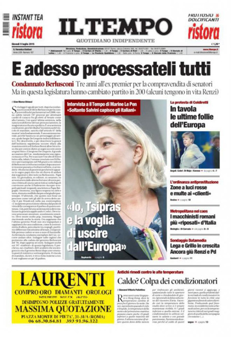 ROMA – Le prime pagine dei giornali di giovedì 9 luglio. La Stampa: “Comprò il voto di un senatore. Tre anni a Berlusconi”. Il Corriere della Sera: “Europa e America divise sulla Grecia”. La Repubblica: “Tsipras apre alle richieste Ue. Cina shock, crolla la borsa”.