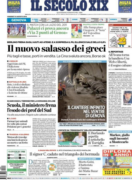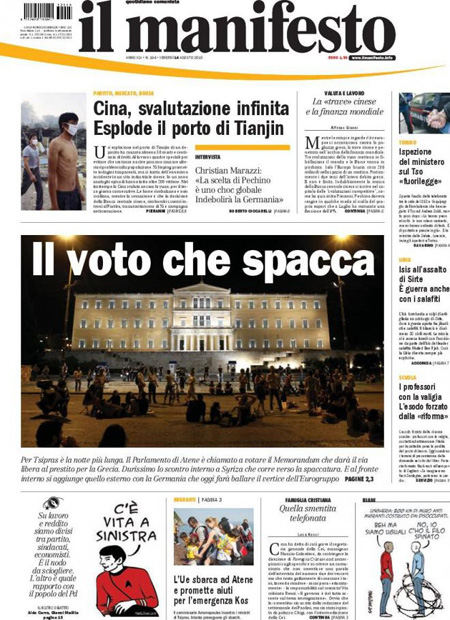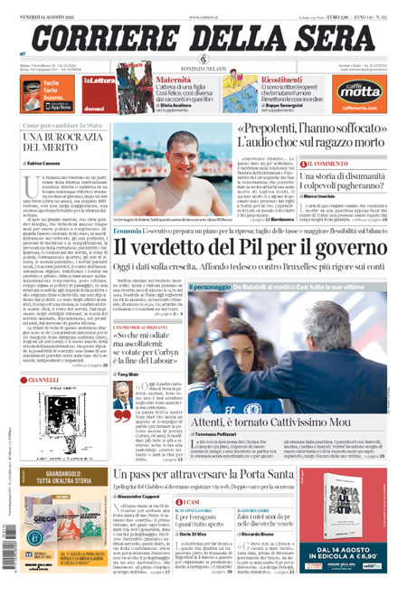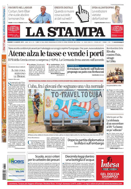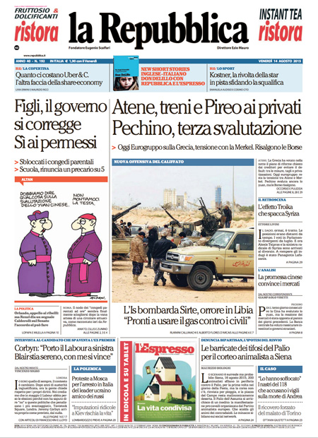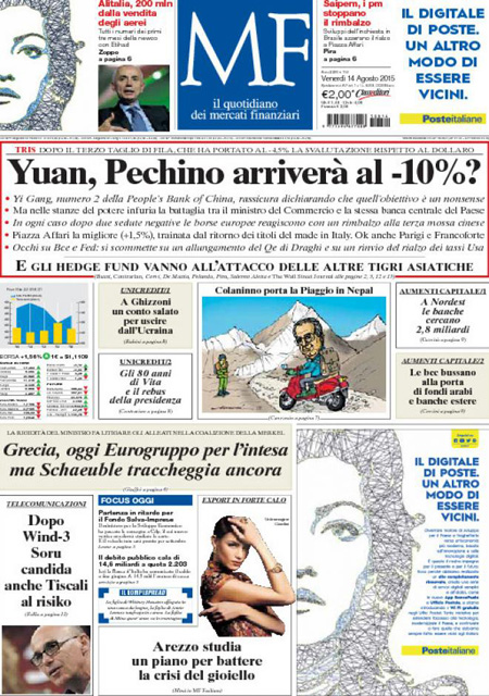 ROMA – Le prime pagine dei giornali di venerdì 14 agosto. La Stampa: “Atene alza le tasse e vende i porti”. La Repubblica: “Atene, treni e Pireo ai privati. Pechino, terza svalutazione”. Il Corriere della Sera: “Il verdetto del Pil per il governo”.
