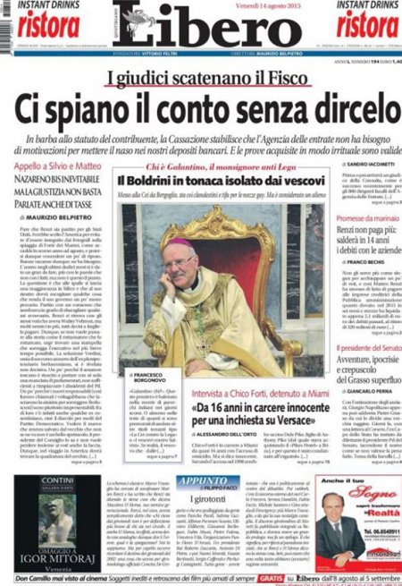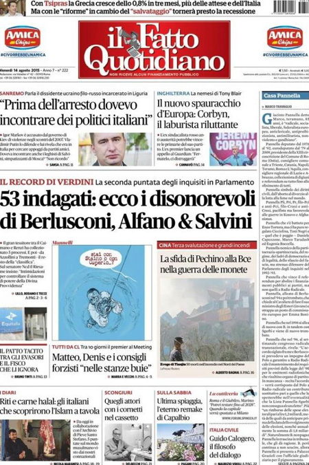 Il Fatto Quotidiano: “53 indagati: ecco i disonorevoli di Berlusconi, Alfano e Salvini”. Il Giornale: “Gli amici degli invasori”. Libero: “Ci spiano il conto senza saperlo”.
