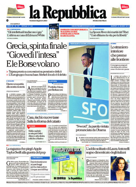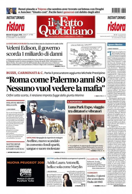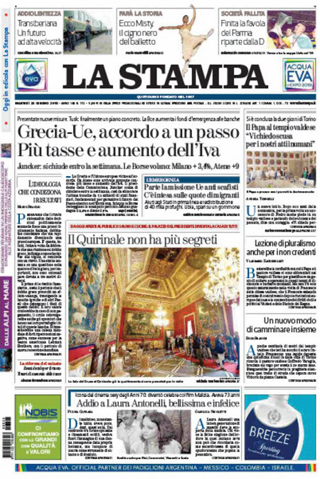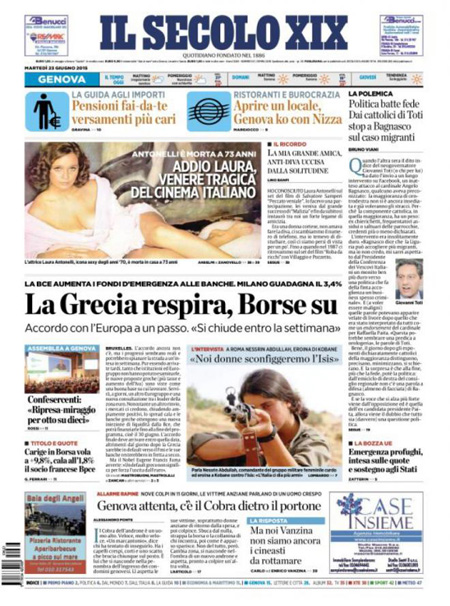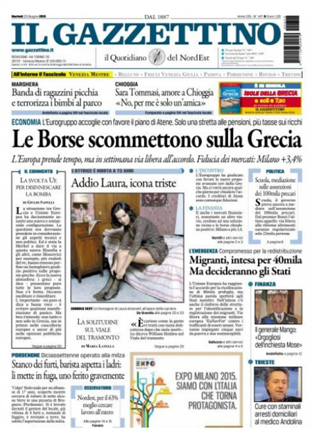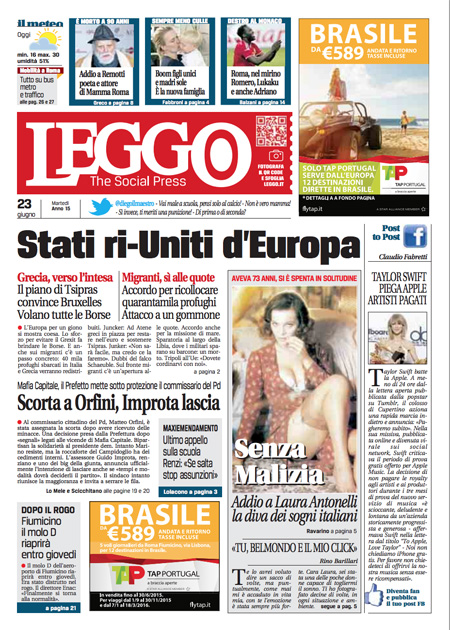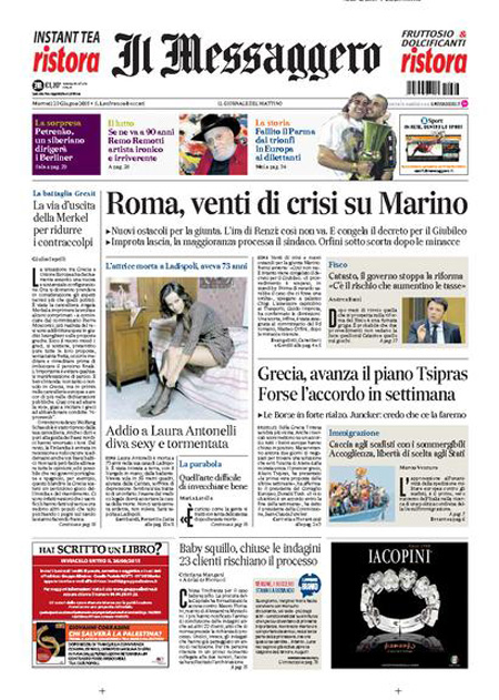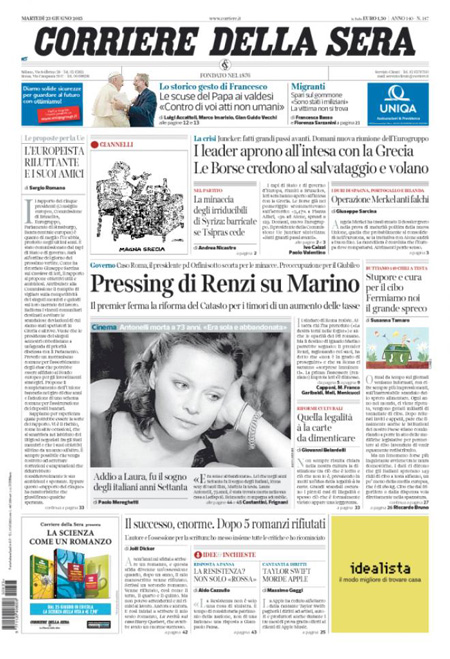 ROMA – I giornali di oggi, 23 giugno, aprono con i progressi nella trattativa per il nuovo prestito alla Grecia e con i sempre più gravi problemi del comune di Roma e del sindaco Ignazio Marino. Tutti i giornali di oggi danno spazio in prima pagina anche alla notizia della morte dell’attrice Laura Antonelli.