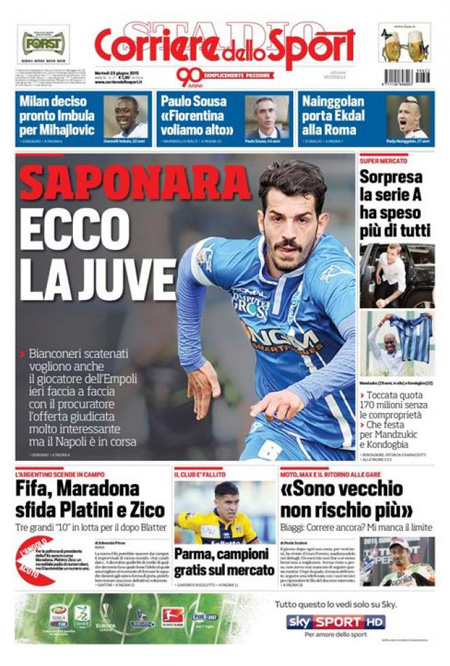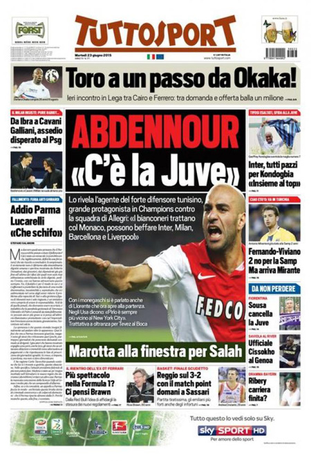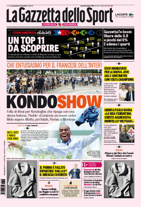 Sui giornali sportivi (Gazzetta dello Sport, Corriere dello Sport e Tuttosport) viene presentato il nuovo calciatore comprato dall’Inter, il francese Geoffrey Kondogbia. Ecco tutte le prime pagine dei giornali di oggi, martedì 23 giugno.