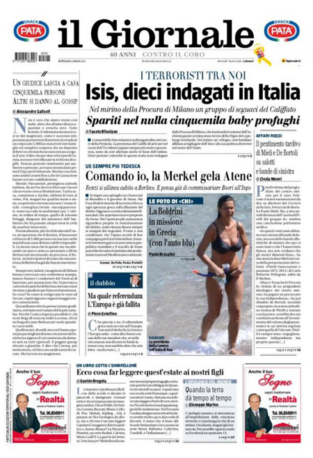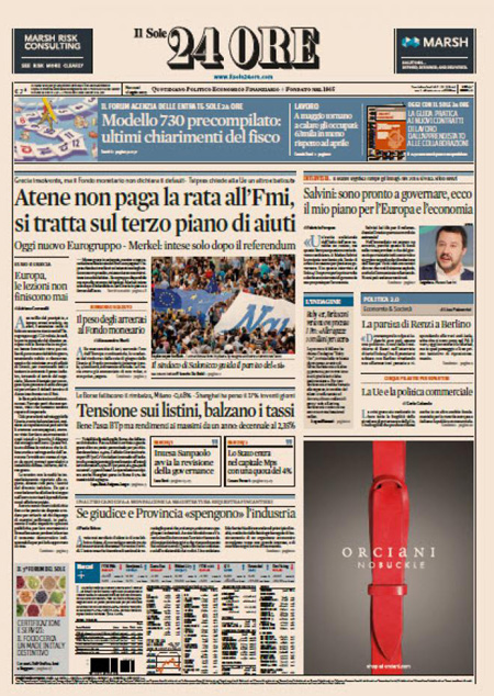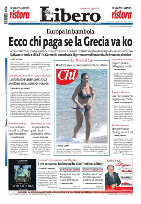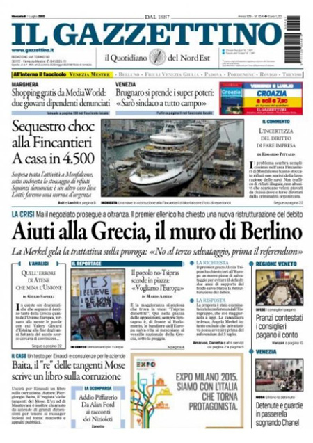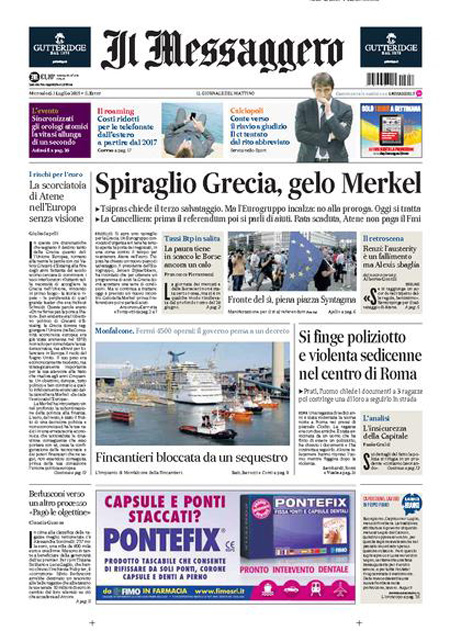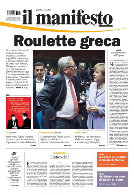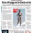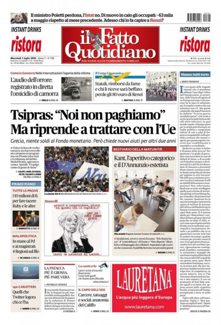 ROMA – Dalla mezzanotte di ieri la Grecia è in default con il Fondo Monetario Internazionale per non aver pagato il rimborso che doveva: anche oggi, 1 luglio, le notizie che riguardano la Grecia occupano quasi tutte le prime pagine dei giornali italiani. Alcuni si concentrano sulle trattative ancora in corso tra l’Europa e il governo Tsipras, altri hanno in prima pagina le foto dalla grande manifestazione di ieri ad Atene per sostenere il Sì al referendum di sabato.