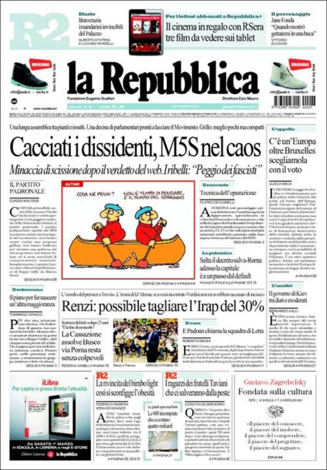 La prima pagina di Repubblica: “Cacciati i dissidenti, M5s nel caos”.