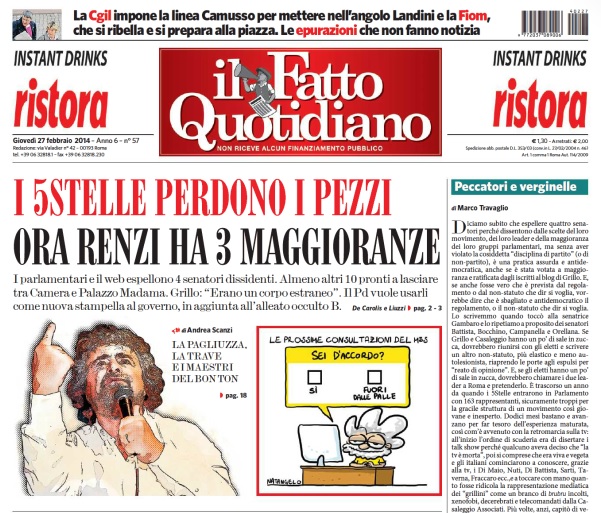 Il Fatto Quotidiano: “I 5 Stelle perdono i pezzi. Ora Renzi ha 3 maggioranze”.