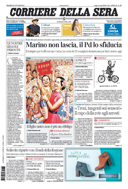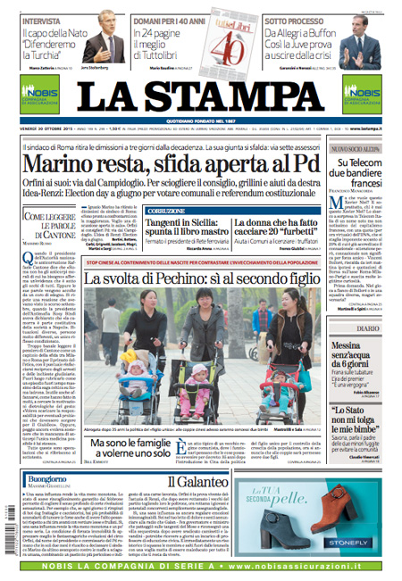 ROMA – Le prime pagine dei giornali di venerdรฌ 30 ottobre. La prima pagina de La Stampa: “Marino resta, sfida aperta al Pd”. La prima pagina del Corriere della Sera: “Marino non lascia, il Pd lo sfiducia. E’ indagato per truffa nel caso Onlus. La conta dei 25 consiglieri dimissionari per farlo cadere oggi”. La prima pagina de La Repubblica: “Marino sfida Renzi: resto sindaco. Indagato per gli scontrini a Roma. Il Pd ai consiglieri: dimettetevi tutti. L’ira del Premier. L’ipotesi della Procura รจ il peculato”. La prima pagina de Il Messaggero: “Marino resta, ma il Pd: รจ finita. Il sindaco ritira le dimissioni: confronto in aula”.