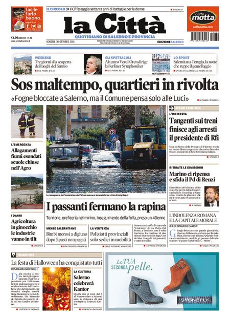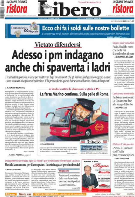 La prima pagina de Il Manifesto: “Mostro Marino”. La prima pagina de Il Giornale: “Marino sfida Renzi. Un kamikaze a Roma. Il sindaco ritira le dimissioni: vuole farsi esplodere con tutto il Pd. Berlusconi, rilancio liberale: salva la fondazione Einaudi”. L’Unitร : “L’ottavo re di Roma. Marino contro tutti. Fa dietrofront e ritira le dimissioni. Ma assessori e consiglieri Pd se ne vanno. A 40 giorni dal Giubileo, Capitale nel caos, non solo amministrativo. Ora il commissario, poi il voto”. Avvenire: “La scuola ritrovata”. La prima pagina del Fatto Quotidiano: “Un ufficio nella sede del Pd per trattare affari e appalti”. Libero: “Vietato difendersi. Adesso i pm indagano anche chi spaventa i ladri. Tre cittadini sparano in aria per mettere in fuga i malviventi che gli stanno svaligiando negozio oย casa: sono accusati di esplosioni pericolose. E’ la prova che in questo paese ormai hanno vinto i delinquenti”. Queste le prime pagine dei giornali di venerdรฌ 30 ottobre.