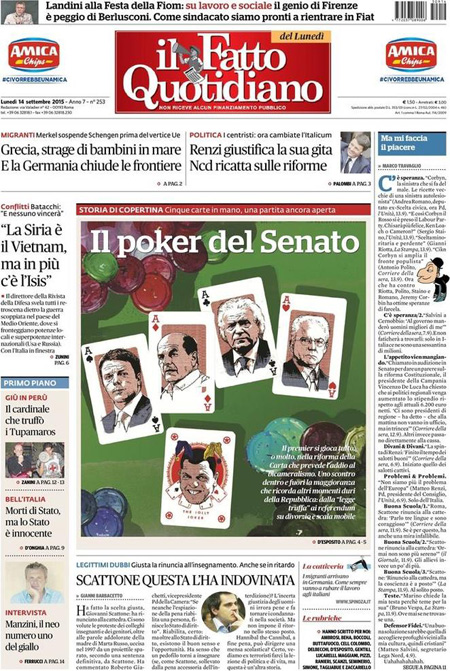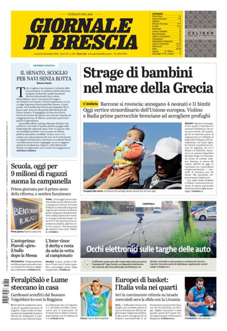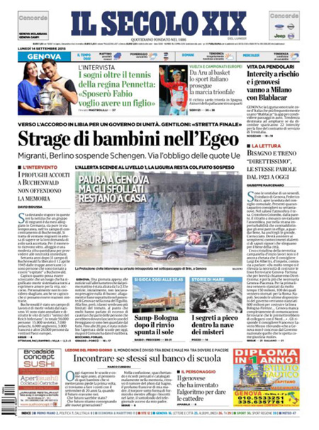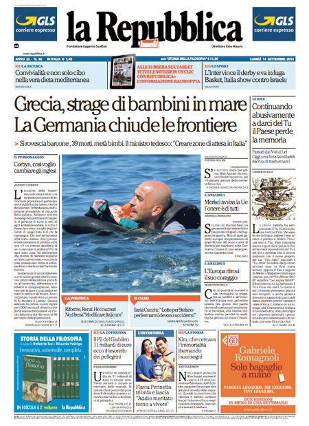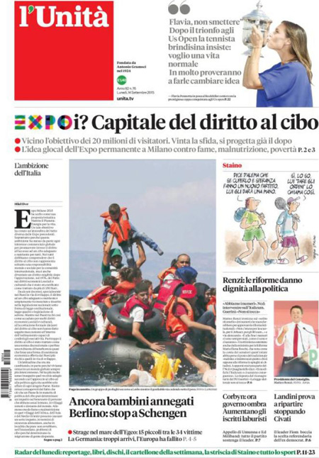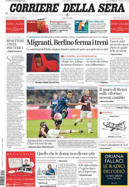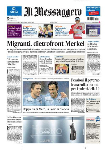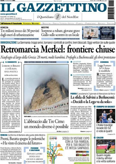ROMA – Le due notizie in apertura sui quotidiani di oggi, lunedì 14 settembre, sono sempre legate all’immigrazione, con la decisione della Germania di ripristinare i controlli alla frontiera con l’Austria e la nuova tragedia in mare nell’Egeo, dove un barcone si è rovesciato causando una quarantina di morti fra i quali molti bambini.