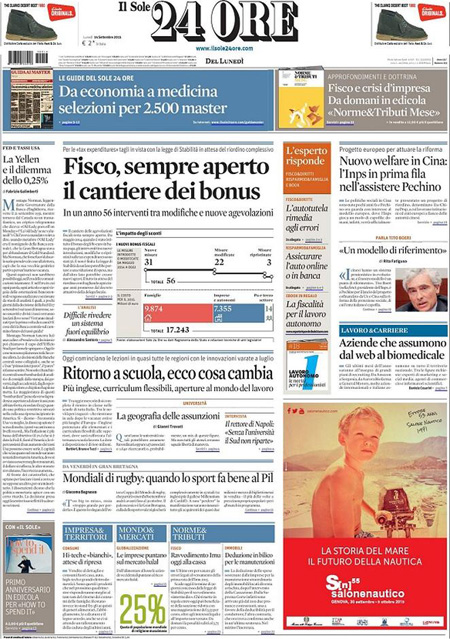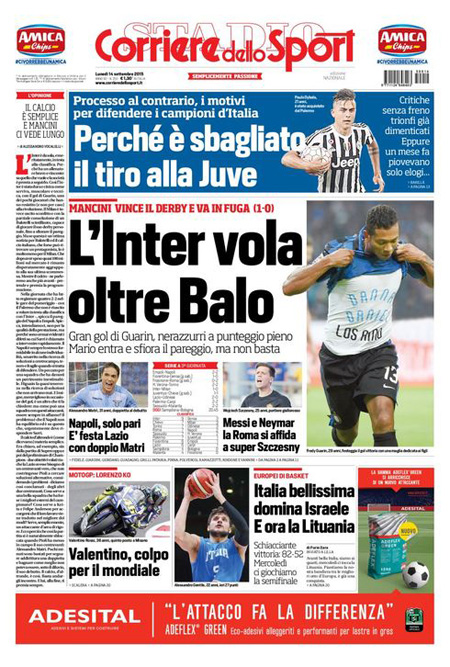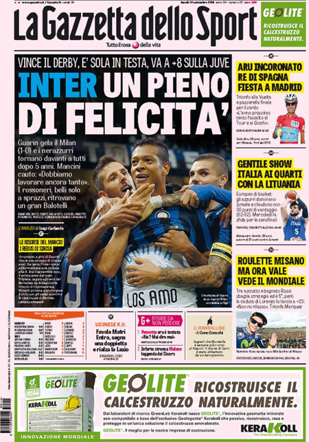 Ampio spazio su molti quotidiani è dedicato poi alle notizie sportive, con la vittoria dell’Inter, che resta sola in testa alla classifica, nel derby di Milano, quelle dell’Italia del basket e di Aru nella Vuelta di ciclismo, e ancora i commenti alla decisione di Flavia Pennetta di ritirarsi dopo aver vinto gli US Open di tennis.