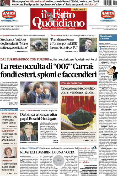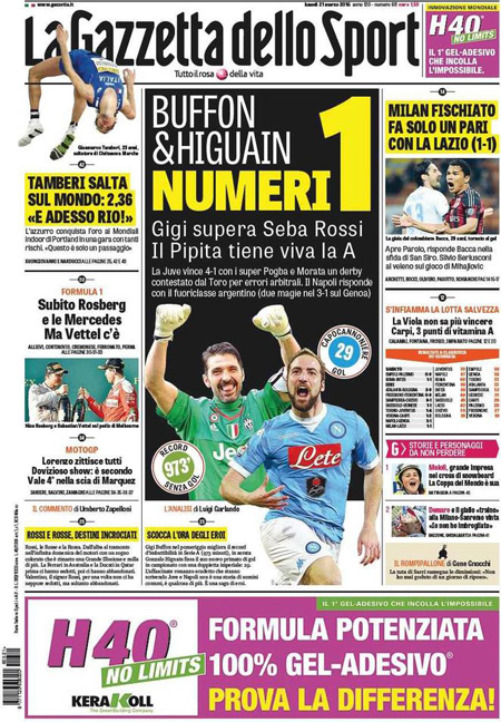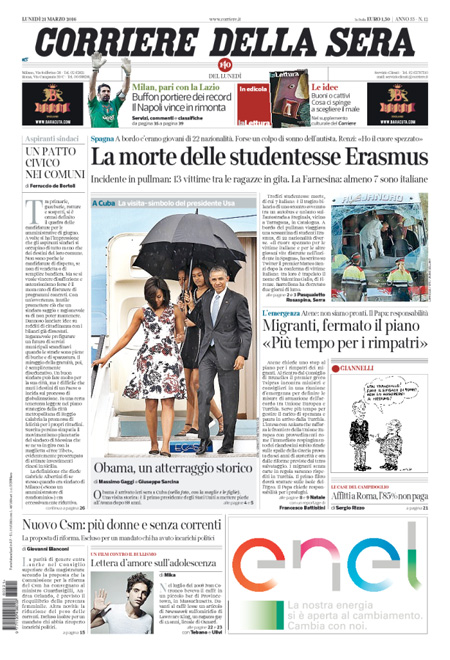 Fa una scelta diversa Repubblica, che apre sulla visita a Cuba del presidente degli Stati Uniti Barack Obama, mentre i quotidiani sportivi si occupano delle vittorie di Juventus e Napoli in testa alla classifica e soprattutto del nuovo record di imbattibilità per un portiere stabilito da Buffon.