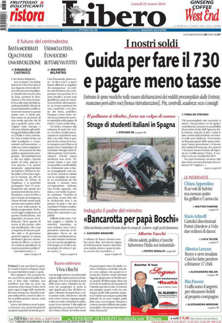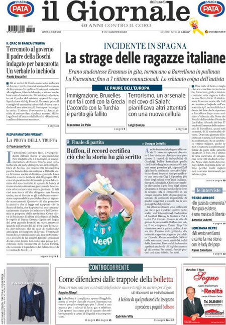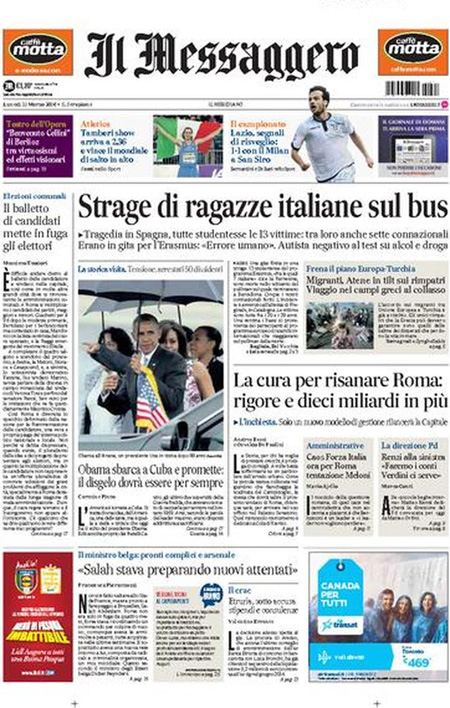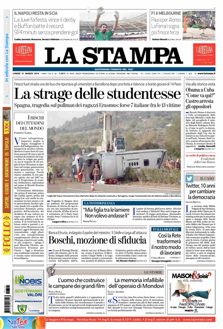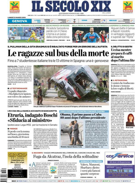 ROMA – Quasi tutti i giornali di oggi titolano in apertura sull’ incidente stradale in Spagna ad un pullman che portava un gruppo di studenti Erasmus da Valencia a Barcellona che ha provocato almeno tredici morti, fra i quali anche diversi italiani.