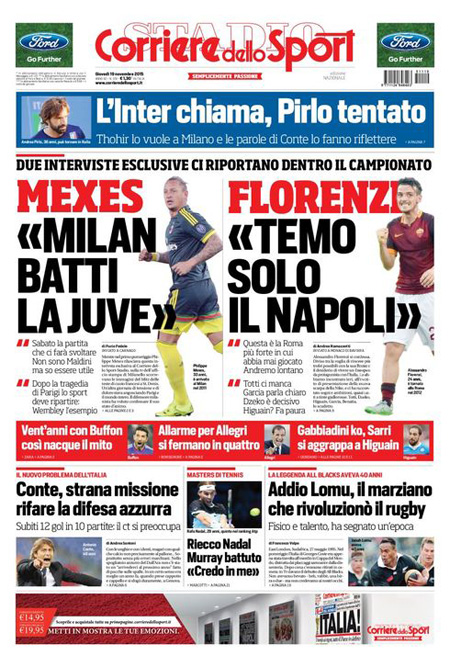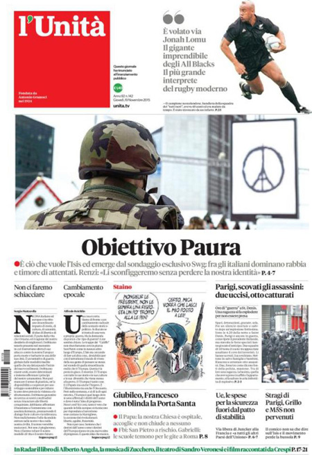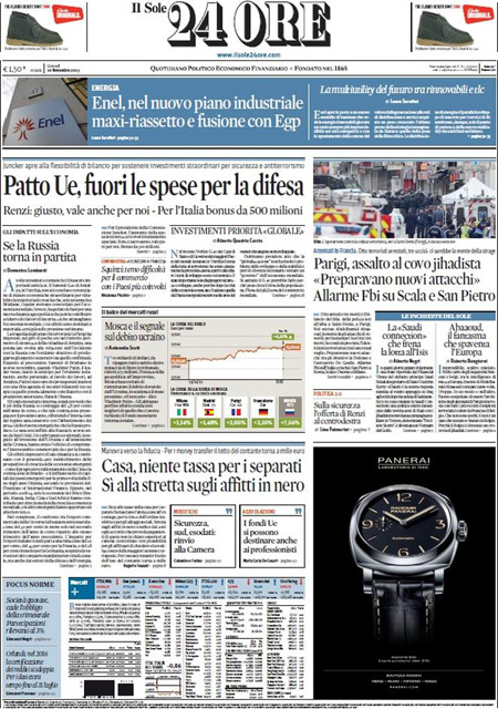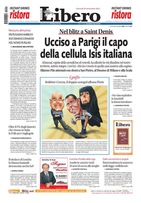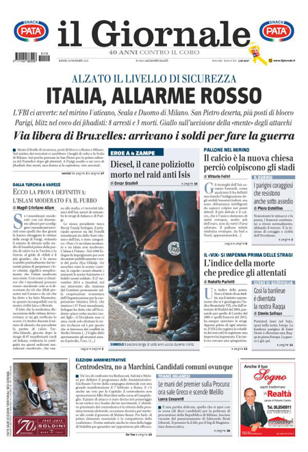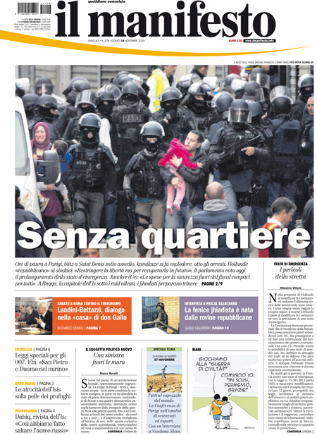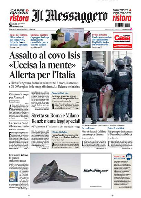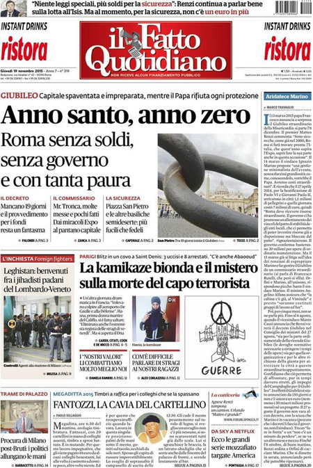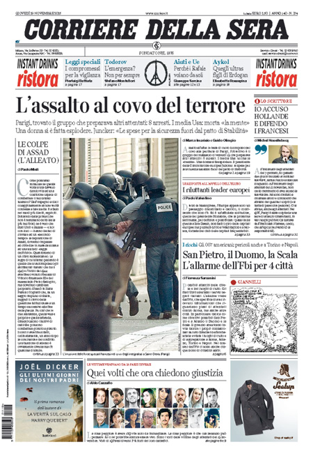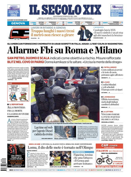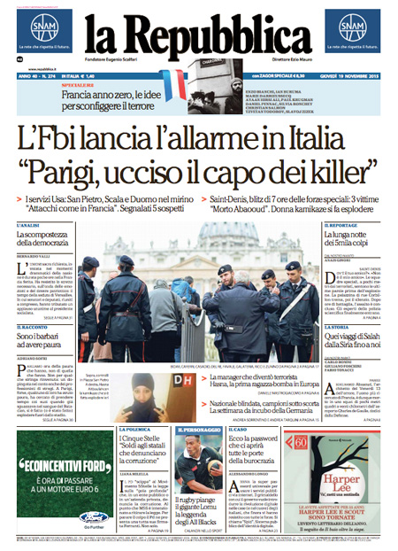 ROMA – Oggi, 19 novembre, è sempre il terrorismo in Europa la notizia che occupa le aperture di tutti i giornali, con l’operazione della polizia francese in una casa di Saint-Denis, un comune in periferia di Parigi, dove si erano rifugiati dei terroristi sospettati di essere i responsabili degli attentati di venerdì scorso. Nell’operazione sono morte due persone, fra cui una donna che si è fatta esplodere, e ne sono state arrestate otto. Poi si parla dell’allarme per i possibili attentati in Italia che sarebbe stato dato dall’FBI.