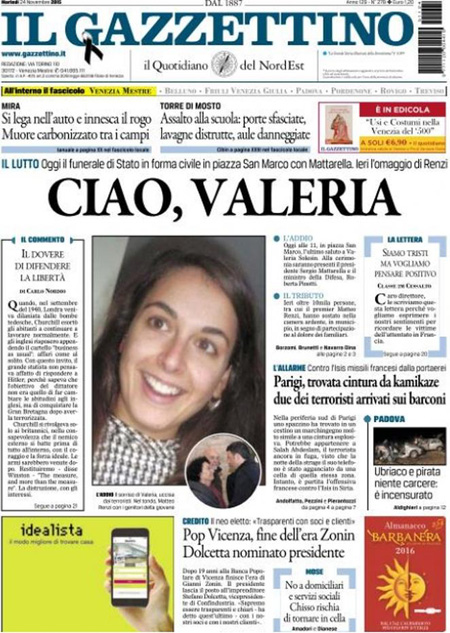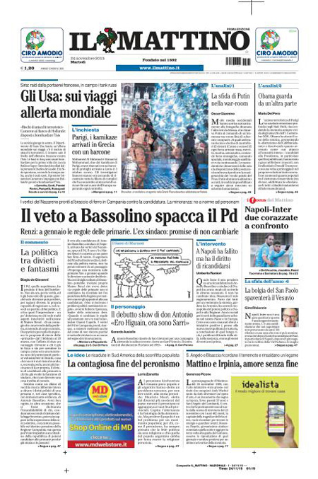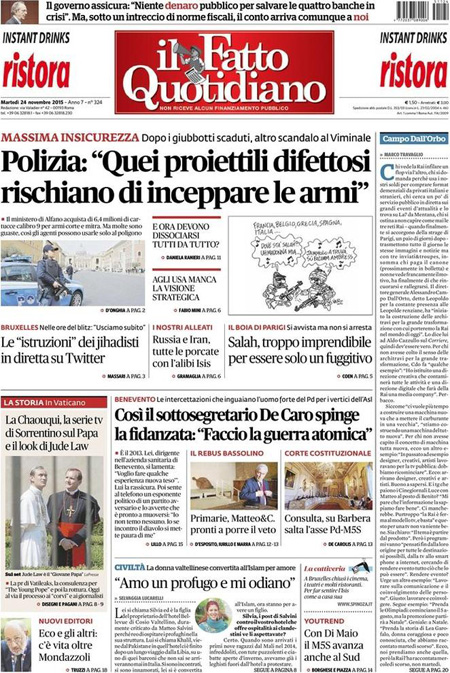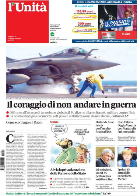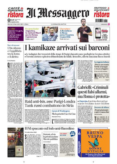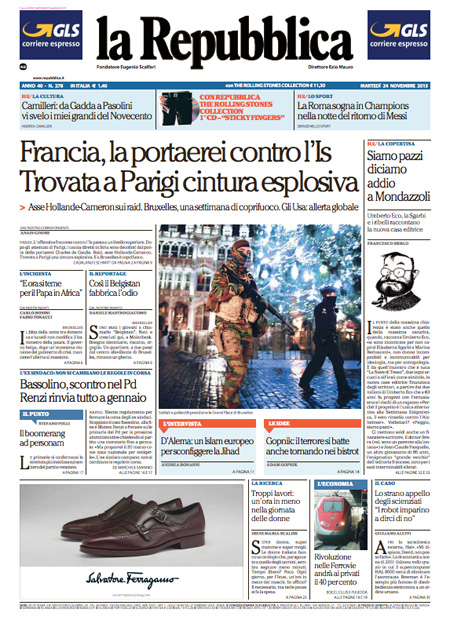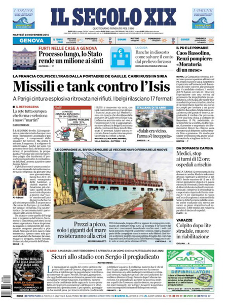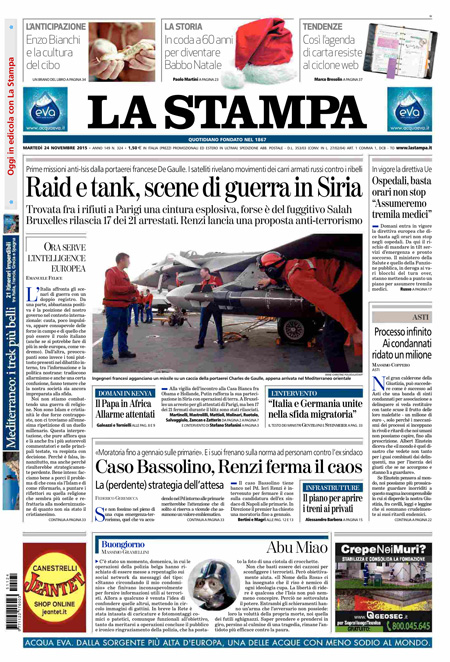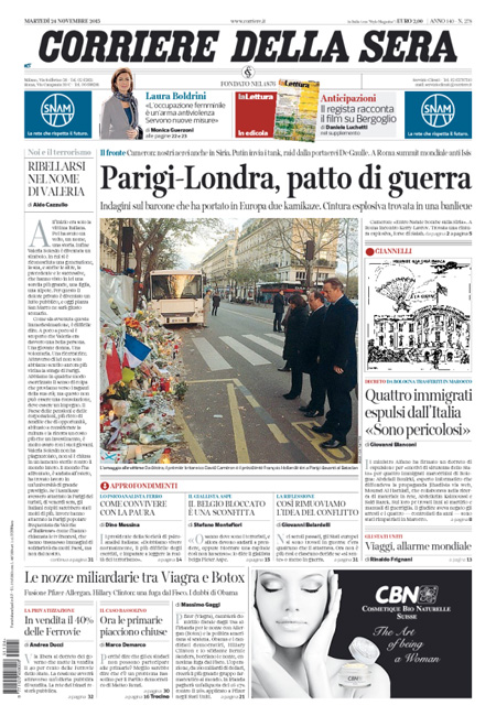 ROMA – Le prime pagine di martedรฌ 24 novembre. La prima pagina della Stampa: “Raid e tank, scene di guerra in Siria. Trovata fra i rifiuti a Parigi una cintura esplosiva, forse รจ del fuggitivo Salah”. La prima pagina del Corriere della Sera: “Parigi-Londra, patto di guerra. Indagini sul barcone che ha portato in Europa due kamikaze. Cintura esplosiva trovata in una banlieu”. La prima pagina de La Repubblica: “Francia, la portaerei contro l’Is. Trovata a Parigi cintura esplosiva”.
