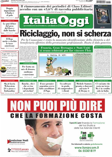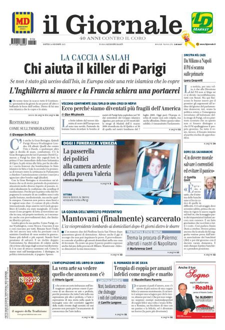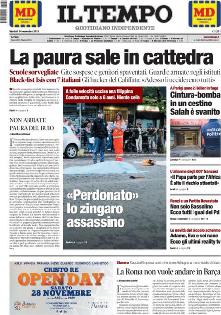 La prima pagina de Il Sole 24 Ore: “In borsa il 40% di Fs nel 2016”. La prima pagina de Il Messaggero: “I kamikaze arrivati sui barconi. Le indagini: due terroristi della strage di Parigi sbarcati come profughi in Grecia a ottobre”. Il Manifesto: “Stati d’allarme. A dieci giorni dagli attentati di Parigi buio fitto sulle indagini, liberati quasi tutti gli arrestati in Francia”. La prima pagina de Il Giornale: “La caccia a Salah. Chi aiuta il killer di Parigi. Se non รจ giร stato ucciso dall’Isis, in Europa esiste una rete islamica che lo copre”. L’Unitร : “Il coraggio di non andare in guerra”. La prima pagina di Libero: “La guerra italiana al terrore. libero chi progetta gli attentati”. La prima pagina de Il Tempo: “La paura sale in cattedra”. Queste le prime pagine dei giornali di martedรฌ 24 novembre.