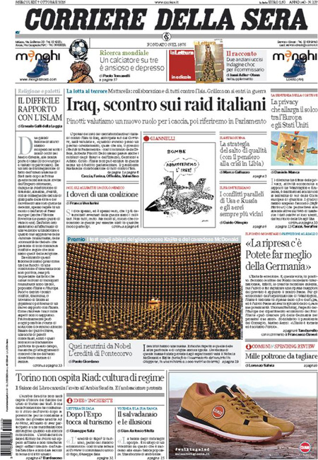 ROMA – Le prime pagine di mercoledì 7 ottobre. La Stampa: “Attacco all’Isis, i piani dell’Italia”. Il Corriere della Sera: “Iraq, scontro su raid italiani”. La Repubblica: “Attacco in Siria, scontro Nato-Putin”.