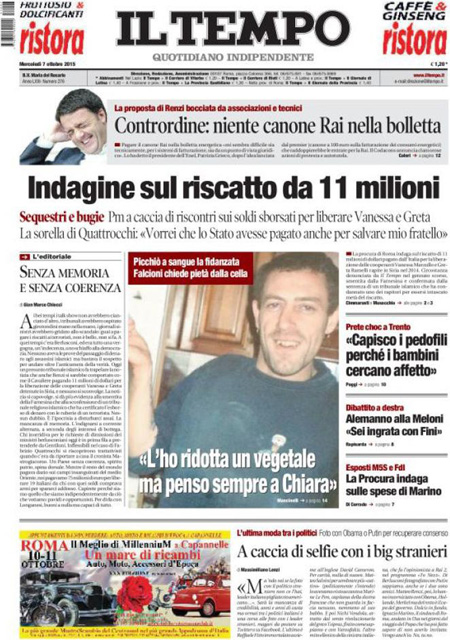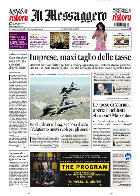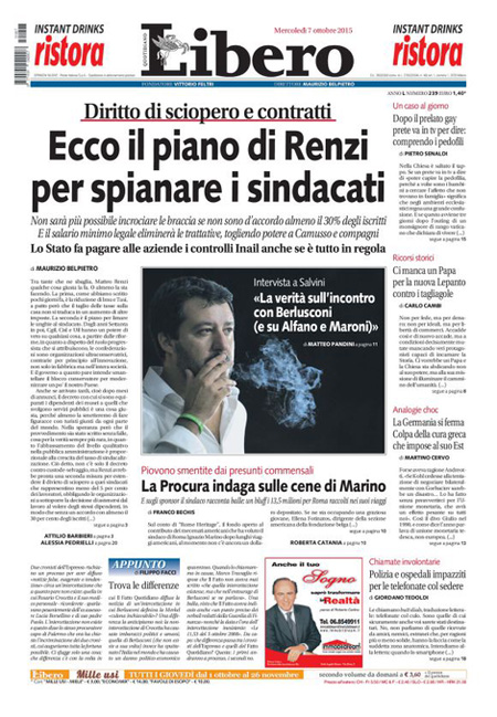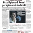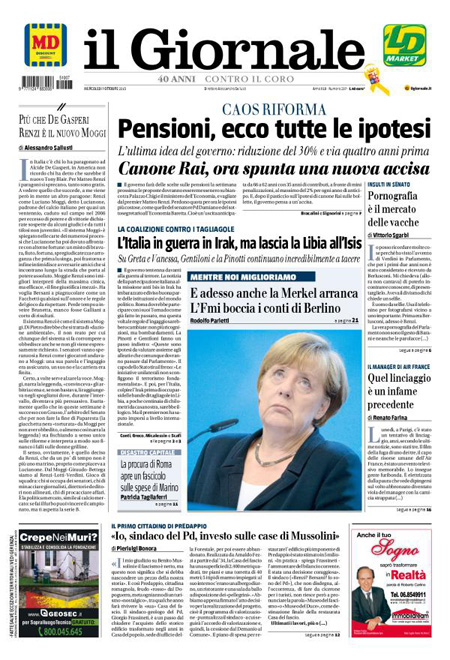 Il Messaggero: “Imprese, maxi taglio delle tasse”. Il Giornale: “Pensioni, ecco tutte le ipotesi”. Il Fatto Quotidiano: “Siamo in guerra (ma non si dice)”. Libero: “Ecco il piano di Renzi per spianare i sindacati”.