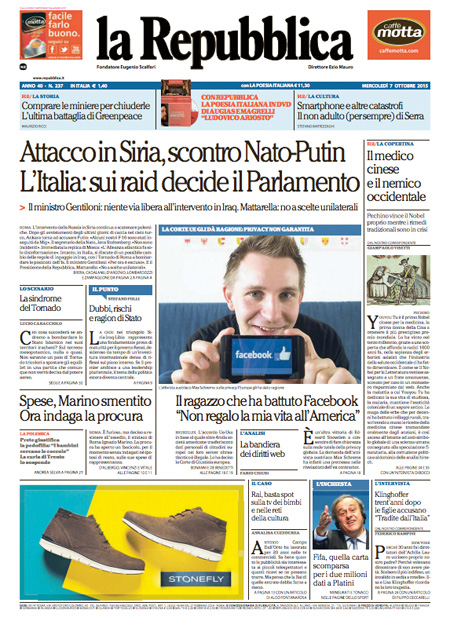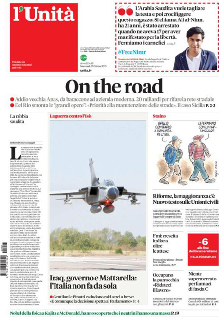 ROMA – Le prime pagine di mercoledì 7 ottobre. La Stampa: “Attacco all’Isis, i piani dell’Italia”. Il Corriere della Sera: “Iraq, scontro su raid italiani”. La Repubblica: “Attacco in Siria, scontro Nato-Putin”.
