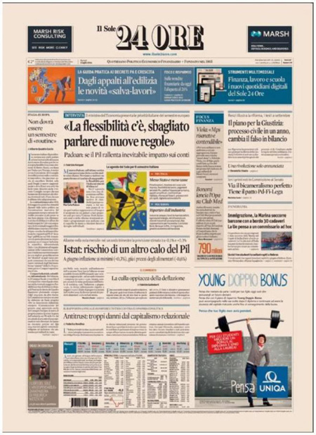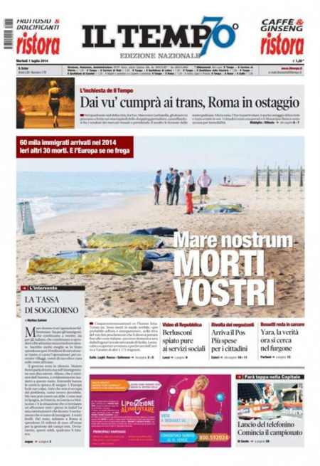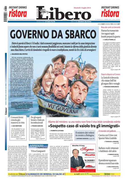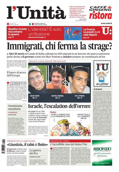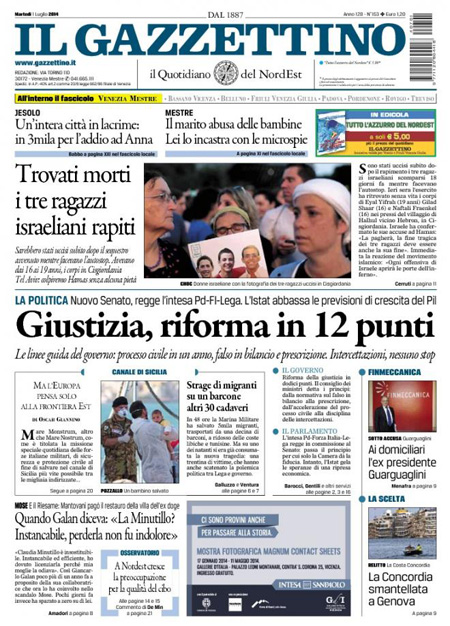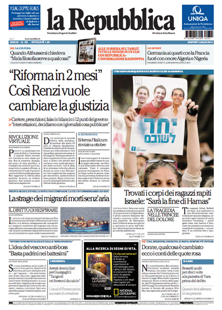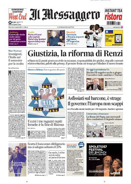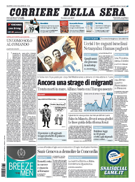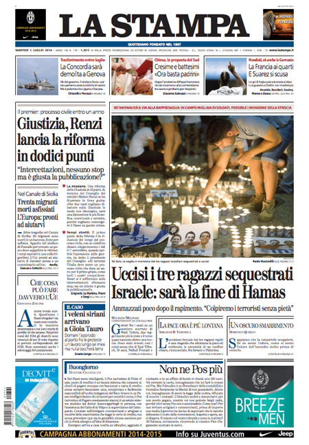 ROMA – I quotidiani di oggi, 1 luglio, si dividono le aperture fra tre notizie diverse: il ritrovamento dei cadaveri dei tre ragazzi israeliani rapiti vicino a Hebron e le minacce del governo israeliano a Hamas, accusato di essere responsabile della loro uccisione, la nuova strage dell’immigrazione nel canale di Sicilia, dove trenta migranti sono morti asfissiati in un barcone che ne conteneva più di seicento, e la riforma della giustizia annunciata ieri sera dal Presidente del Consiglio Renzi dopo la riunione del consiglio dei ministri.