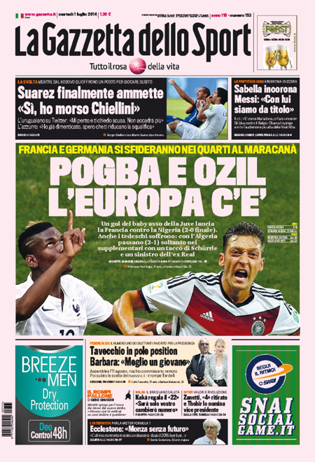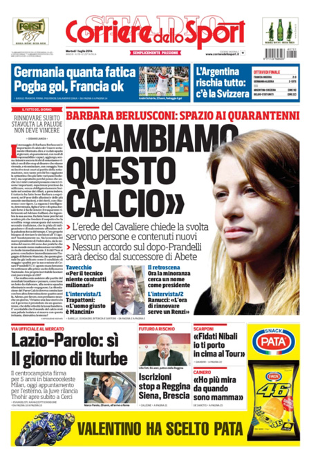I quotidiani sportivi danno risalto ai Mondiali dove Francia e Germania hanno sconfitto rispettivamente Nigeria e Algeria e si affronteranno nei quarti di finale, e alle parole sul sistema calcio italiano di Barbara Berlusconi.
