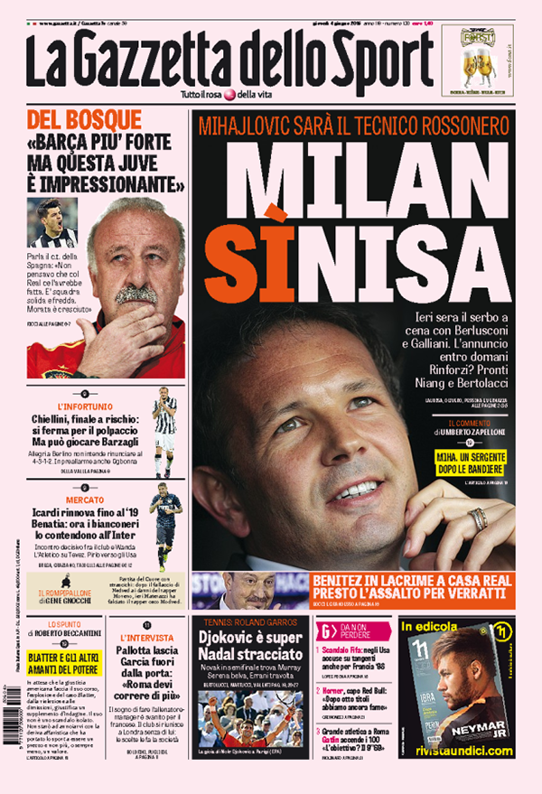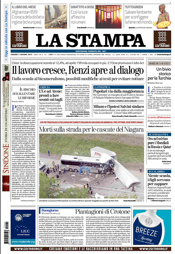 ROMA – Sulle prime pagine dei giornali di oggi, 4 giugno, ci sono soprattutto i nuovi dati sull’occupazione in Italia, e poi ancora le questioni che riguardano l’elezione del nuovo governatore della Campania Vincenzo De Luca, l’eventuale accordo tra Grecia e Unione Europea, e l’immagine dell’incidente che in Pennsylvania ha coinvolto un pullman di turisti italiani. Sui giornali sportivi è dato per certo l’arrivo come nuovo allenatore al Milan di Sinisa Mihajlovic.