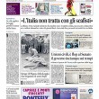 ROMA – Sulle prime pagine dei giornali di oggi, 23 luglio, aprono ancora parlando dei quattro italiani rapiti in Libia domenica 19 luglio: Repubblica parla ancora del “giallo dello scambio”, mentre il Corriere apre con le parole di Angelino Alfano “Non si tratta con gli scafisti”, in riferimento alla possibilità che il rapimento possa essere stata una vendetta per le nuove politiche di lotta al traffico di migranti.