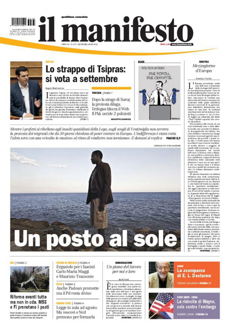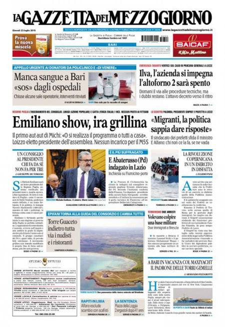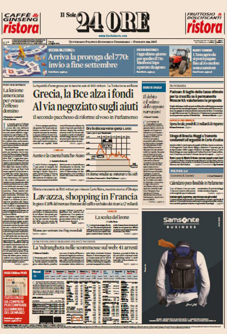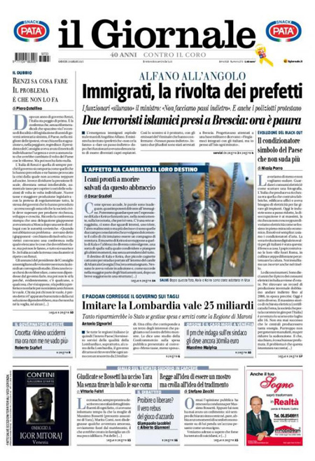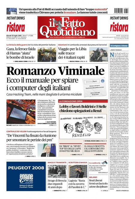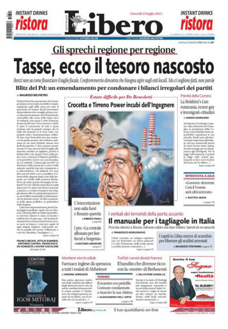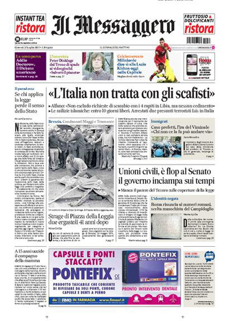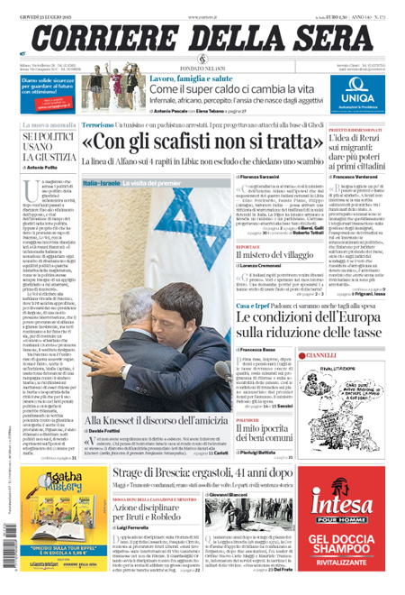 ROMA – Sulle prime pagine dei giornali di oggi, 23 luglio, aprono ancora parlando dei quattro italiani rapiti in Libia domenica 19 luglio: Repubblica parla ancora del “giallo dello scambio”, mentre il Corriere apre con le parole di Angelino Alfano “Non si tratta con gli scafisti”, in riferimento alla possibilità che il rapimento possa essere stata una vendetta per le nuove politiche di lotta al traffico di migranti.