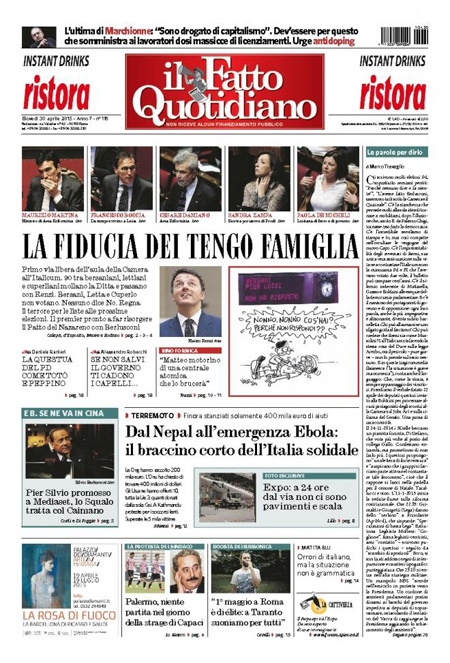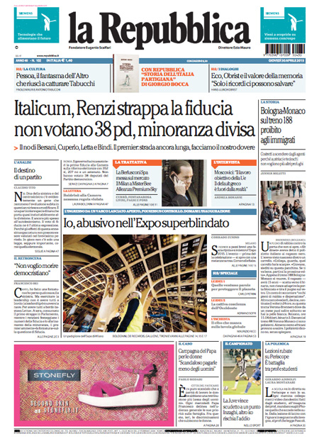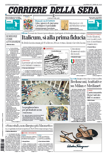 ROMA – Sui giornali di oggi, 30 aprile 2015, l’apertura è dedicata ancora all’esame da parte della Camera della riforma elettorale, sulla quale c’è stato ieri il primo voto di fiducia sul primo articolo della legge, approvato nonostante la non partecipazione al voto di 38 esponenti della minoranza del Partito Democratico, fra i quali l’ex segretario Bersani.
