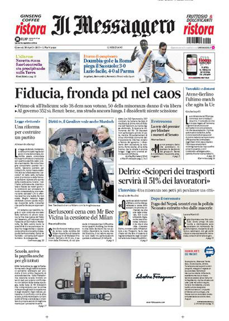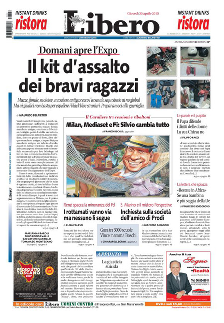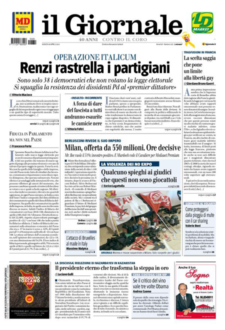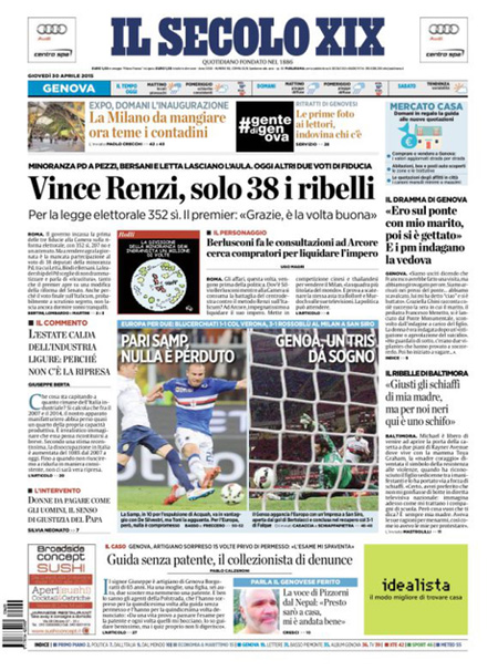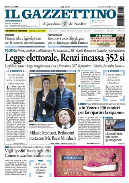 Molto spazio anche alle voci sulle trattative che sarebbero in corso per la cessione da parte di Silvio Berlusconi del Milan e di una quota di Mediaset, e all’attesa per l’apertura dell’Expo di Milano, mentre i quotidiani sportivi titolano sui risultati della giornata di campionato giocata ieri sera con la vittoria della Juventus, alla quale manca ormai solo un punto per la vittoria dello scudetto, e la sconfitta del Milan e il possibile esonero dell’allenatore Inzaghi.