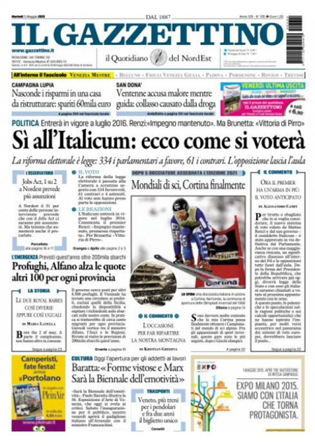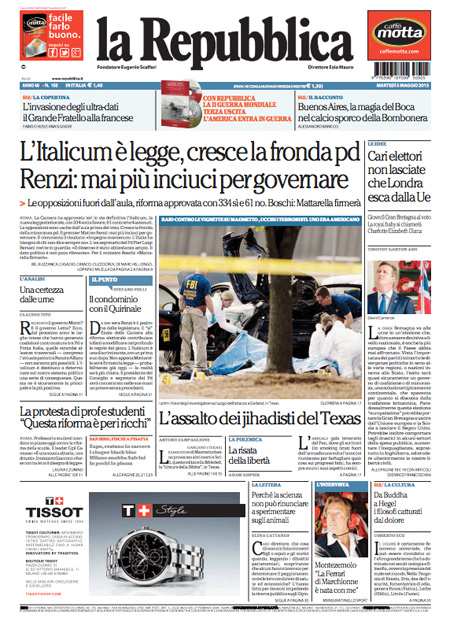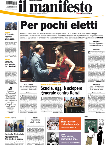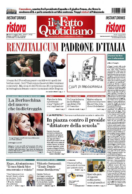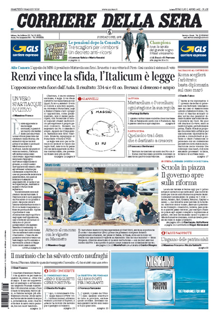 ROMA – Tutti i giornali di oggi, 5 maggio, dedicano l’apertura all’approvazione definitiva da parte della Camera della riforma elettorale, con il voto finale di ieri al quale non hanno partecipato le opposizioni.