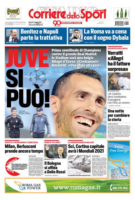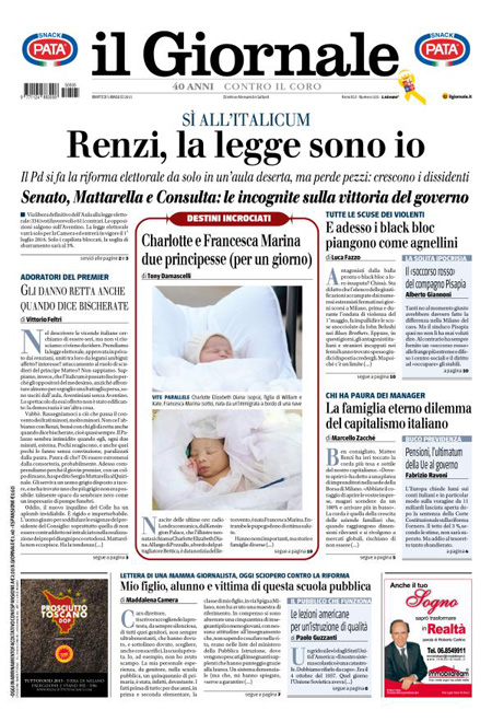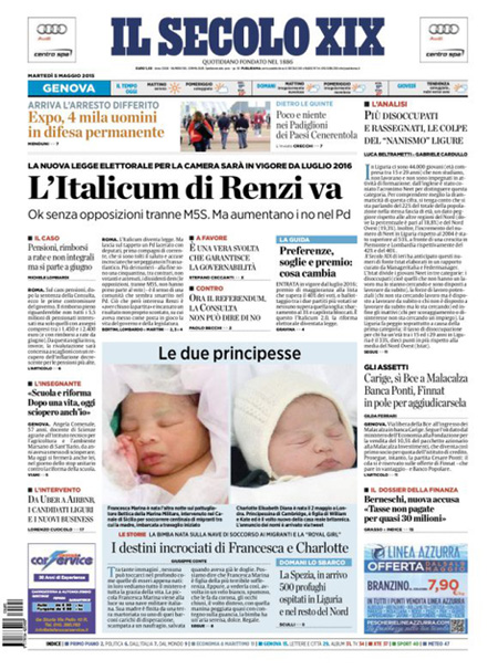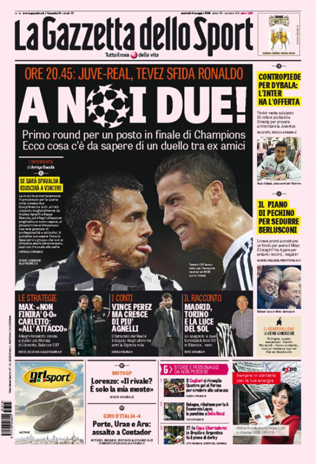L’altra notizia che occupa molto spazio sulle prime pagine è lo sciopero di oggi della scuola per protestare contro la riforma presentata dal governo Renzi, mentre i quotidiani sportivi presentano la partita di andata di stasera per le semifinali di Champions League fra Juventus e Real Madrid.
