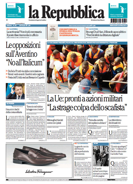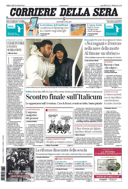 ROMA – Le prime pagine dei giornali di mercoledì 22 aprile. La Stampa: “Italicum, l’Aventino delle opposizioni. Ma Renzi non si ferma”. Il Corriere della Sera: “Scontro finale sull’Italicum”. La Repubblica: “Le opposizioni sull’Aventino: no all’Italicum”.