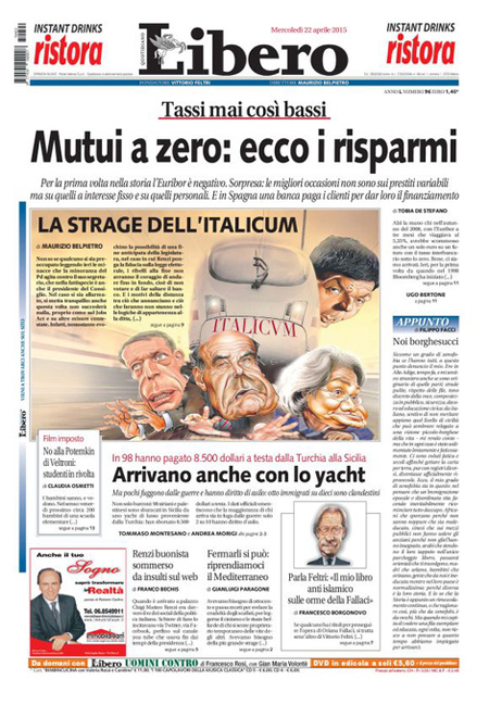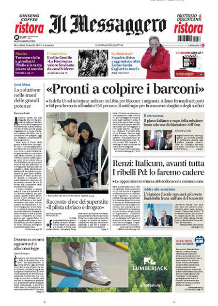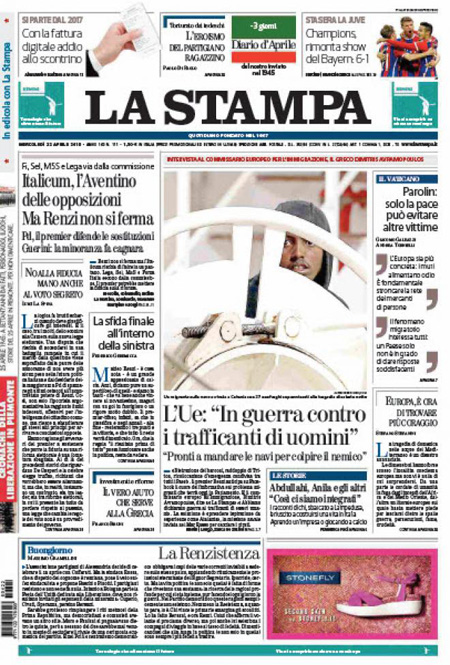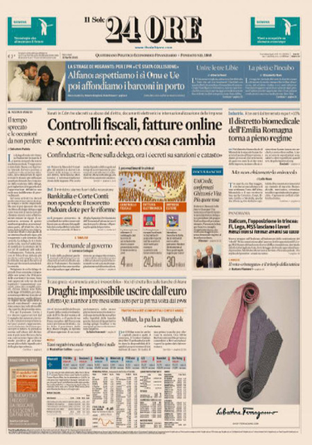 Il Sole 24 Ore: “Controlli fiscali, fatture online e scontrini: ecco cosa cambia”. Il Giornale: “Sparare agli scafisti. Ecco la soluzione”. Il Manifesto: “L’Europa affonda”.