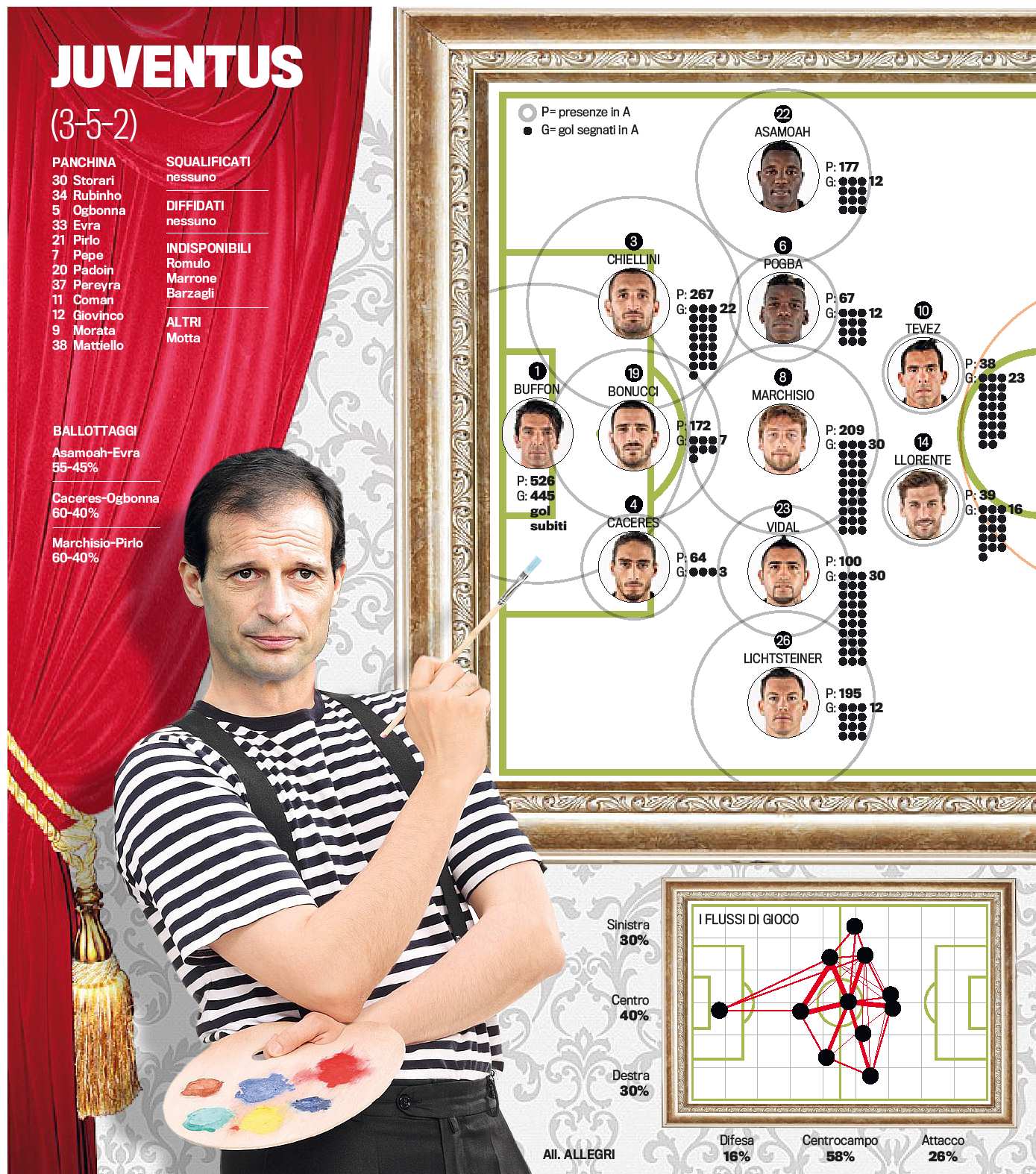 Doppia T Cโรจ poi la suggestione tecnico-alfabetica. Sarร una partita con la doppia T. Tevez contro Totti, gli uomini simbolo. Numeri dieci con senso del gol da centravanti. La mappa dei contrasti della Juve dice che la squadra di Allegri non ruba molti palloni nei territori davanti allโarea. La Roma, in quel settore, รจ un filo piรน ยซcontrastanteยป, ma i dati esprimono tendenze. medie. La Juve non puรฒ ignorare Totti e viceversa la Roma non puรฒ snobbare Tevez. Non si parla di marcature a uomo, che sarebbero anacronistiche, sebbene negli ultimi tempi in A non di rado si sia notato qualcosa del genere. Sarร interessante verificare se Tevez e Totti condizioneranno le mediane avversarie, quanto ci si preoccuperร del ยซfalso noveยป altrui quando questi scivolerร indietro a tramare gioco. Juve-Roma sarร un capolavoro se Tevez e Totti faranno gli artisti, non cโรจ tattica o tatticismo che valga la bellezza di una pennellata dโautore”.