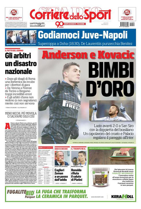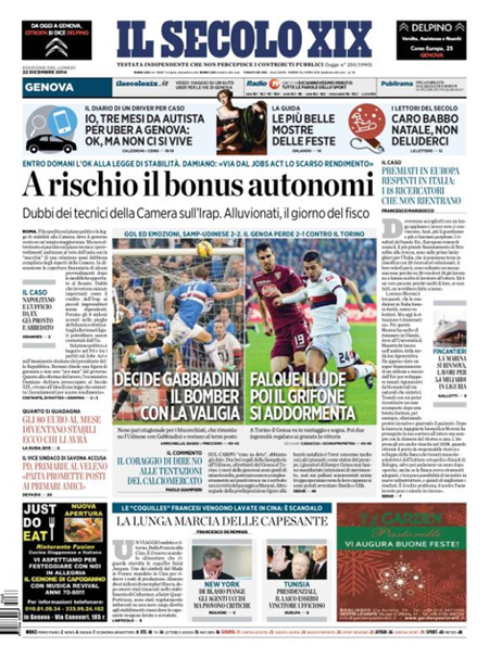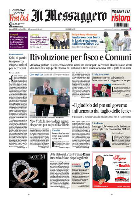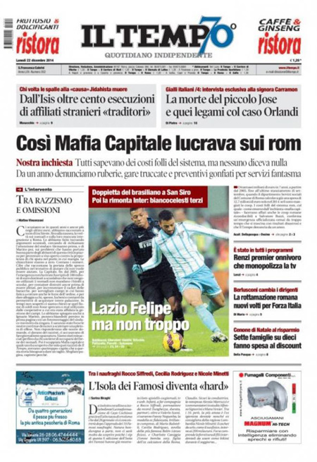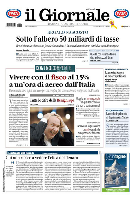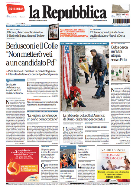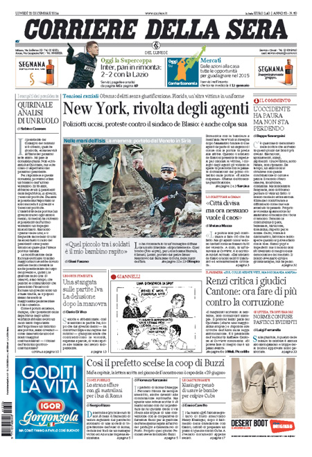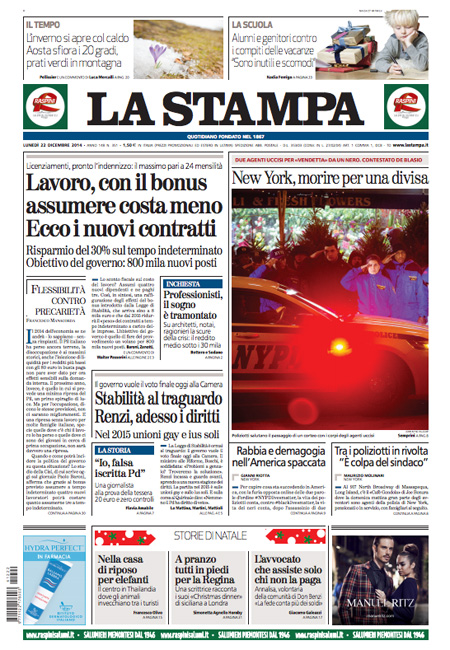 ROMA – Le prime pagine dei giornali di lunedì 22 dicembre 2014. La Stampa: “Lavoro, con il bonus assumere costa meno. Ecco i nuovi contratti”. Il Corriere della Sera: “New York, rivolta degli agenti”. La Repubblica: “Berlusconi e il Colle: non metterò veti a un candidato Pd”. Il Messaggero: “Rivoluzione per fisco e Comuni”. Il Giornale: “Sotto l’albero 50 miliardi di tasse”. Il Tempo: “Così Mafia capitale lucrava sui rom”. La Gazzetta dello Sport: “È tornata la pazza Inter”.