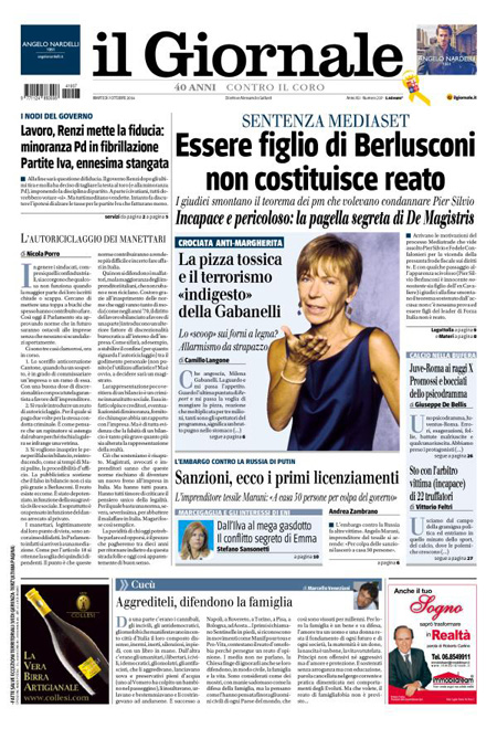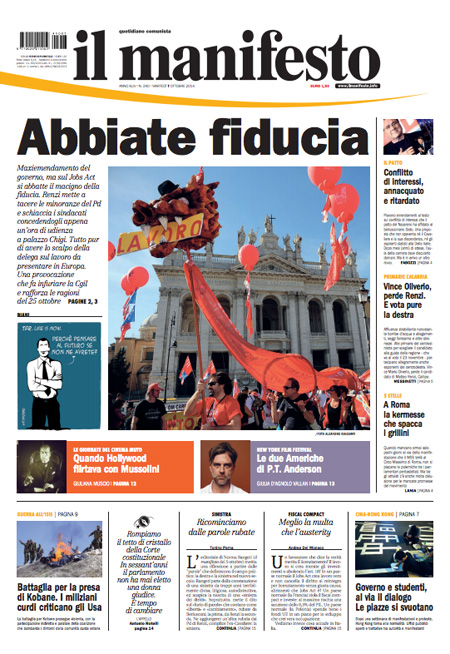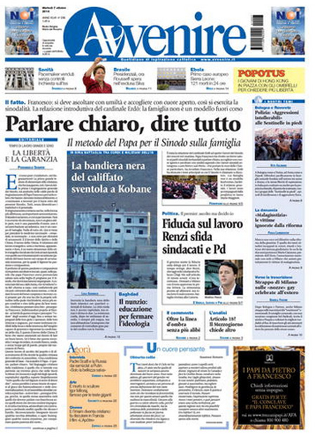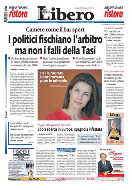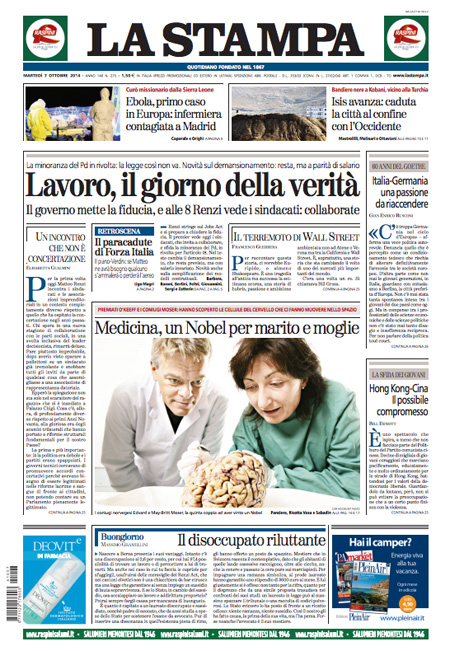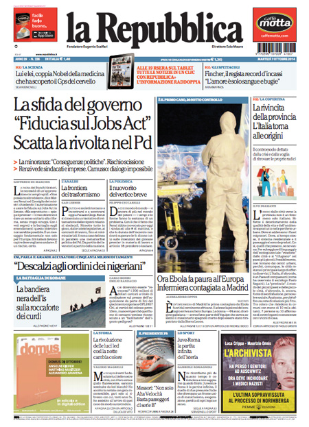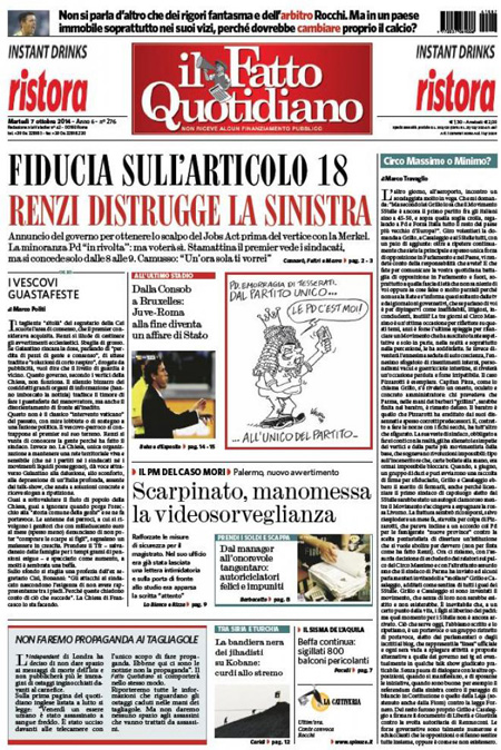 ROMA – Le prime pagine di martedì 7 ottobre 2014. Lavoro, Renzi e Jobs Act: le prime pagine dei giornali. Il Corriere della Ser apre l’intervista al cardinale Ruini: “Noi vescovi siamo qui per cambiare”. La prima pagina de La Repubblica: “La sfida del governo: fiducia sul Jobs Act. Scatta la rivolta nel Pd”. Sul Jobs Act e sul lavoro apre anche La Stampa: “Lavoro, il giorno della verità”. Stesso tema anche nell’apertura de Il Fatto Quotidiano: “Fiducia sull’articolo 18. Renzi distrugge la sinistra”. Libero: “I politici fischiano l’arbitro ma non i falli della Tasi”.