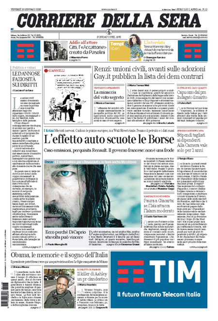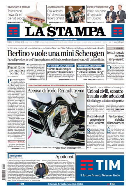 ROMA – Queste le prime pagine dei giornali di venerdì 15 gennaio. La prima pagina della Stampa: “Berlino vuole una mini Schengen. Parla il presidente dell’Europarlamento Schulz: se rimettiamo i controlli Unione finita”. La prima pagina del Corriere della Sera: “L’effetto auto scuote le borse. Caso emissioni, perquisita Renault. Il governo francese: non è una frode”. La prima pagina de La Repubblica: “Pd, scontro finale sulle unioni civili. Bufera su Gay.it”.