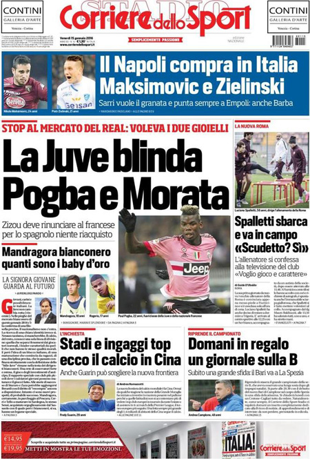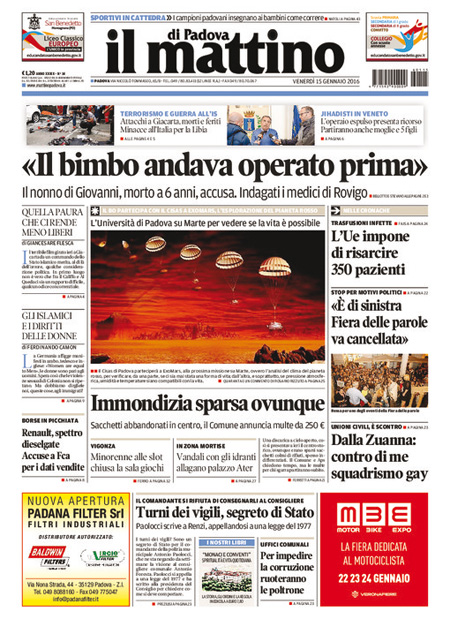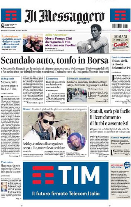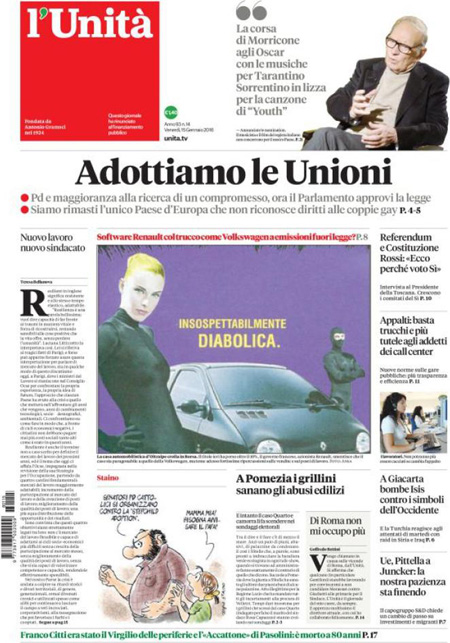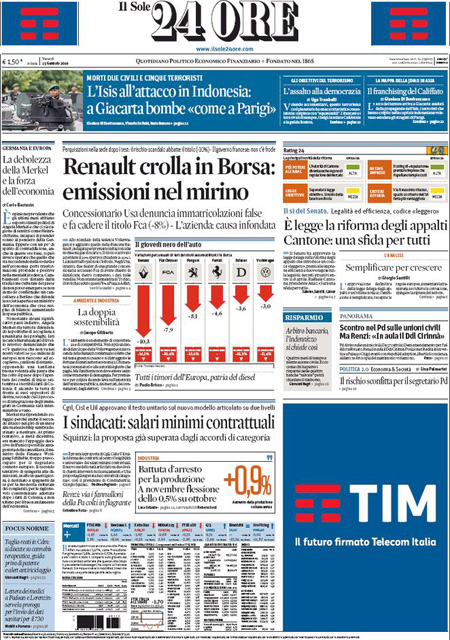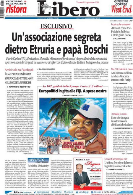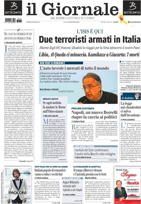 La prima pagina del Messaggero: “Scandalo auto, tonfo in Borsa. Accuse alla Renault per le emissioni, si teme un nuovo caso Volkswagen. Titolo va giù del 10%”. La prima pagina del Giornale: “L’Isis è qui. Due terroristi armati in Italia. Allarme degli 007 francesi: jihadisti in viaggio per la Siria attraverso il nostro Paese”. La prima pagina di Libero: “Esclusivo. Un’associazione segreta dietro Etruria e papà Boschi”. Queste le prime pagine dei giornali di venerdì 15 gennaio.