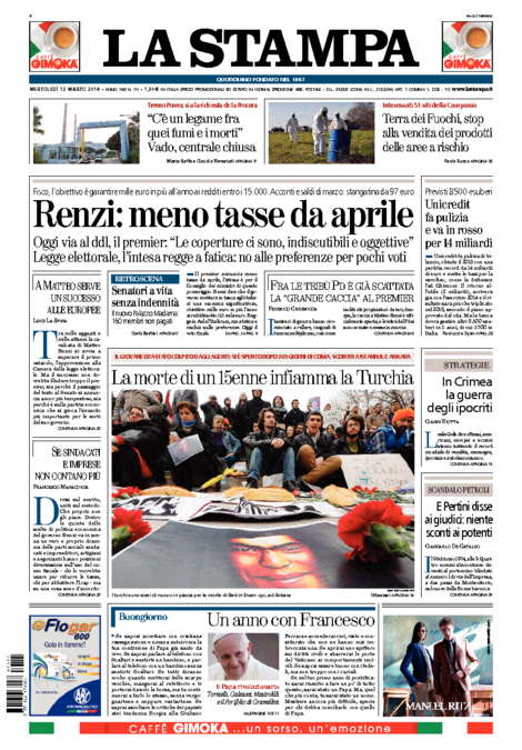 Queste le due notizie che si dividono nelle aperture dei quotidiani nazionali del 12 marzo. C’è anche spazio per l’eliminazione in Champions League del Milan, sconfitto per 4-1 dall’Atletico Madrid di Simeone.