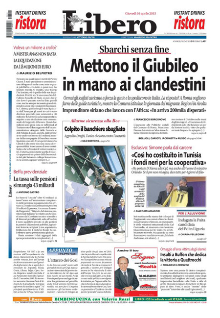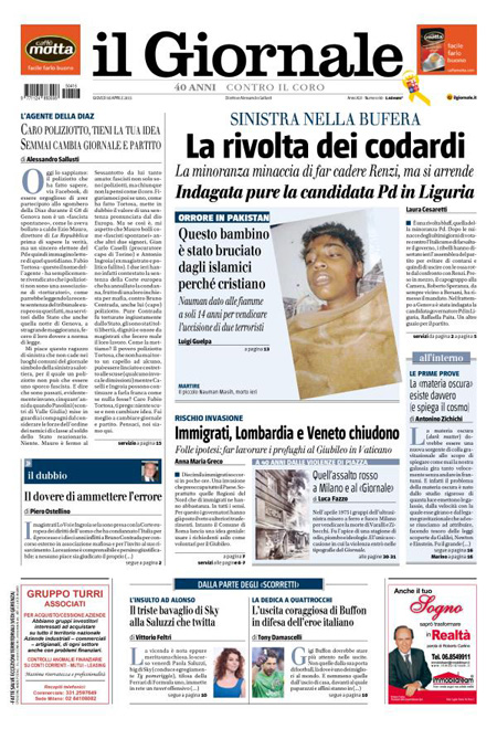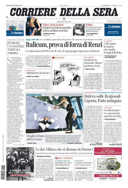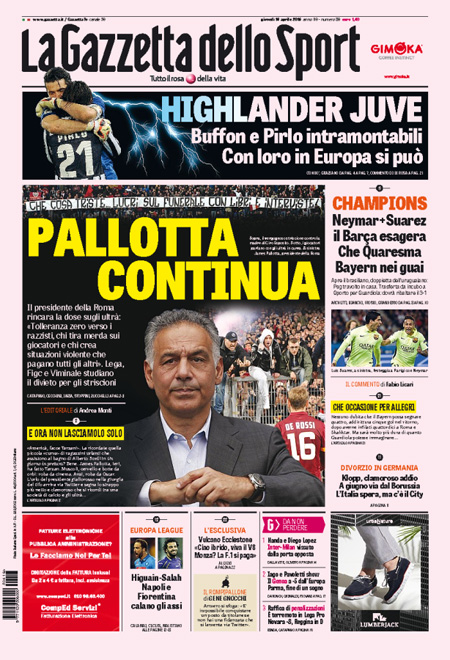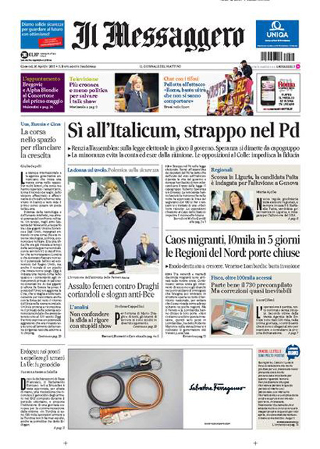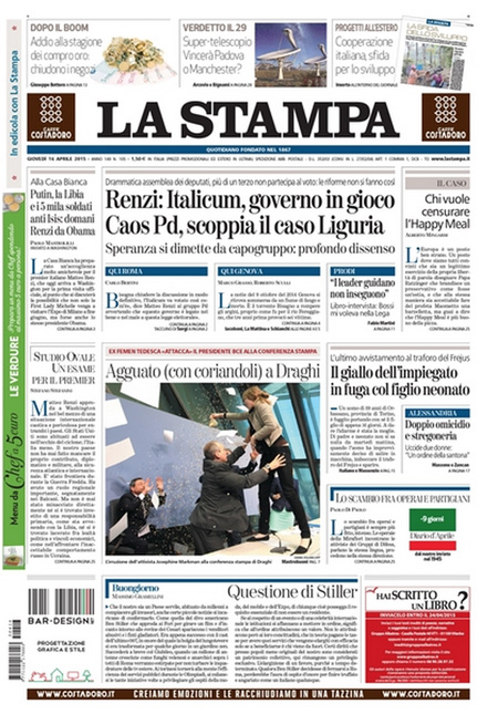 ROMA – La nuova legge elettorale sulle prime pagine di oggi, giovedì 16 aprile, e molti giornali scelgono di dare molto spazio ai coriandoli lanciati contro Mario Draghi da un’attivista durante una conferenza stampa ieri a Francoforte. Tra le altre notizie citate: le accuse della Ue a Google (e risposta di Big G), i problemi del Pd in Liguria e, sui giornali sportivi, le posizioni di James Pallotta – presidente della Roma – contro gli ultras.
