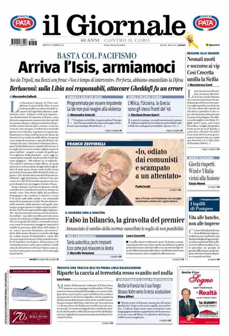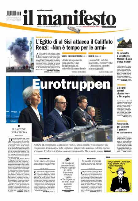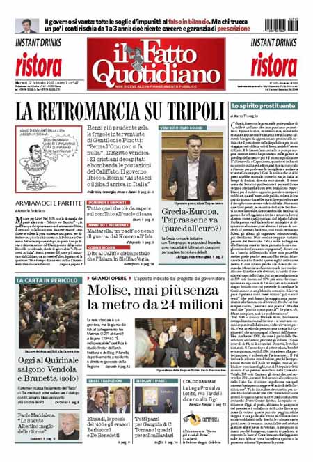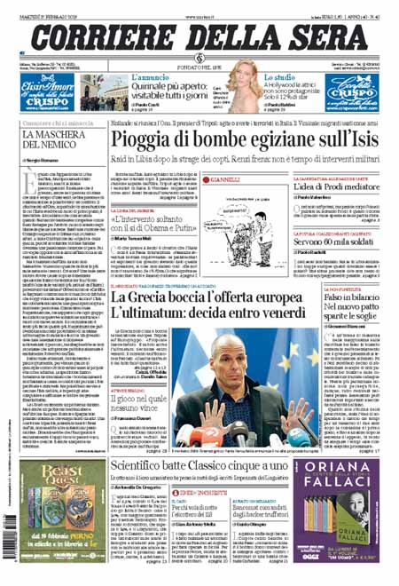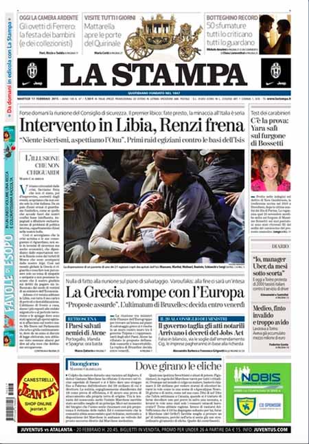 ROMA – Le prime pagine dei giornali di martedì 17 febbraio. Il Corriere della Sera: “Pioggia di bombe egiziane sull’Isis”. La Stampa: “Intervento in Libia, Renzi frena”. La Repubblica: “Tripoli: agite o l’Is arriva a Roma. Renzi frena sull’intervento militare”. Il Giornale: “Basta col pacifismo. Arriva l’Isis, armiamoci”. Il Tempo: “Parole crociate”. Il Manifesto: “Eurotruppen”. Libero: “Dietrofront sulla Libia. Renzi scappa, ci salverà l’Egitto”. Il Fatto Quotidiano: “La retromarcia su Tripoli”.