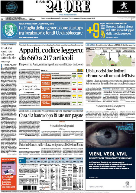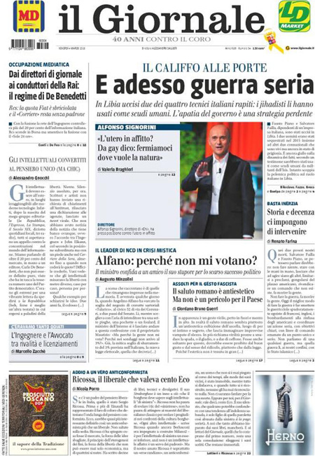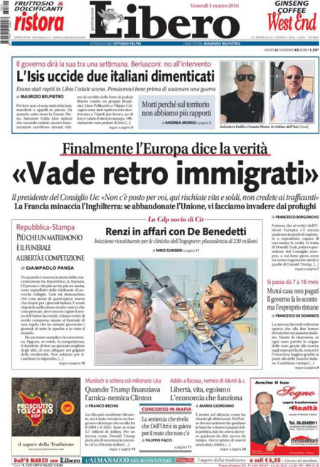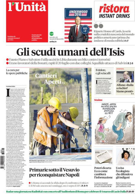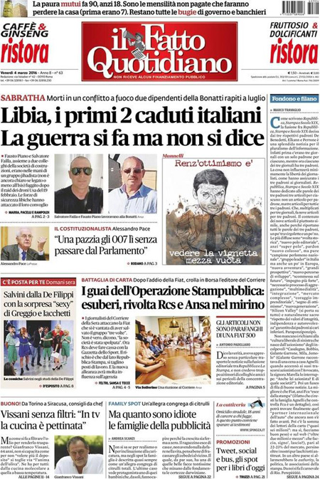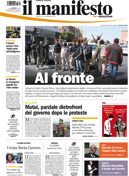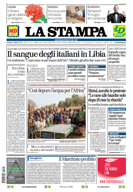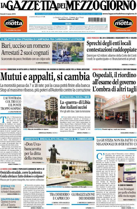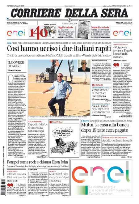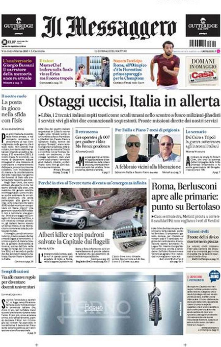 ROMA – Per tutti i giornali di oggi, venerdì 4 marzo, la notizia in apertura è l’uccisione in Libia, durante una azione militare contro le milizie dell’ISIS nel paese, di due dei quattro lavoratori italiani sequestrati nello scorso mese di luglio.