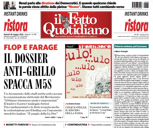 Il Fatto Quotidiano: “Il dossier anti-Grillo spacca il M5s”.