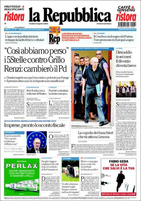 La prima pagina de La Repubblica: “Cosรฌ abbiamo perso, i 5 Stelle contro Grillo”.