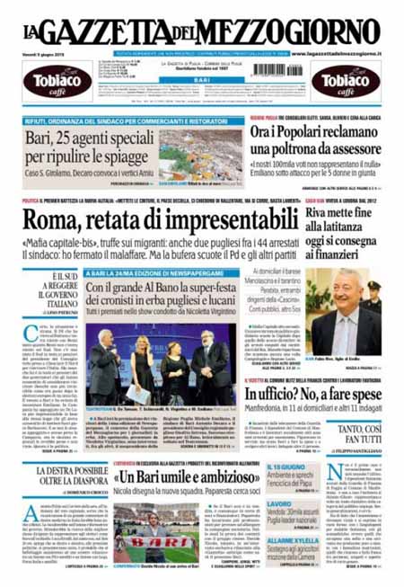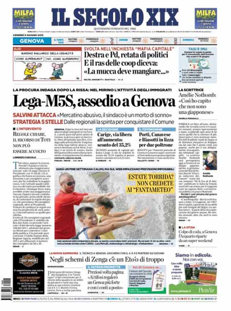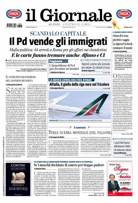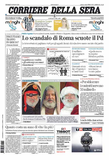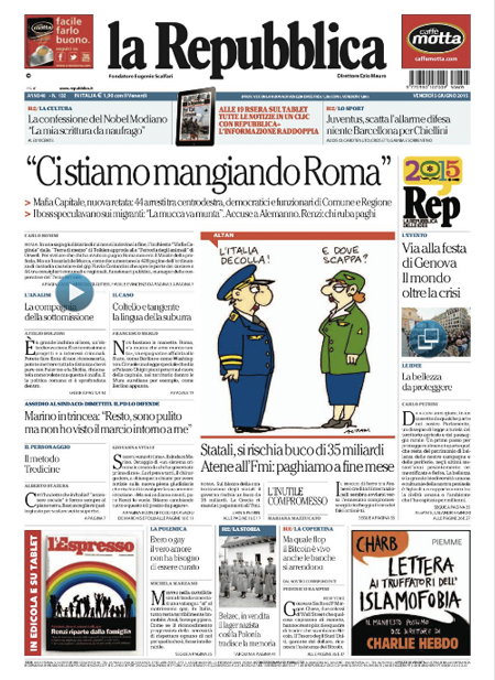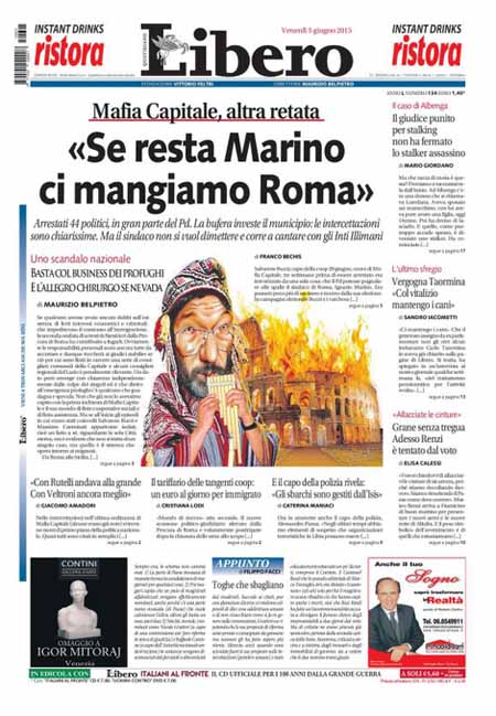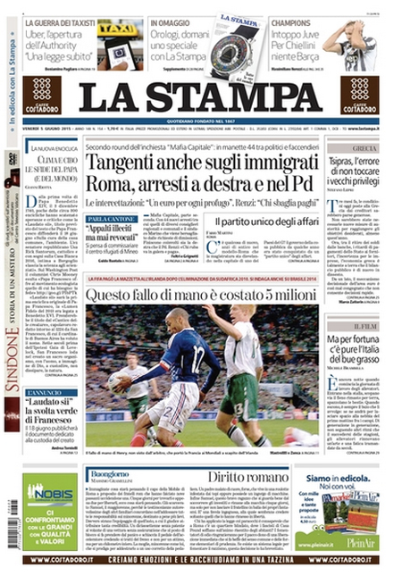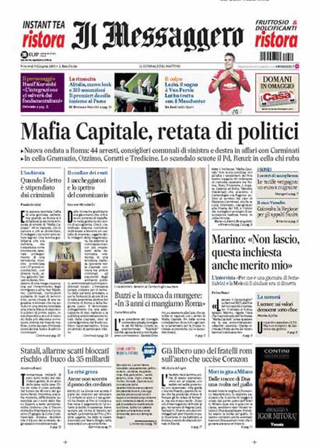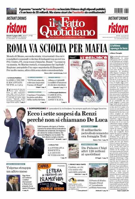 ROMA – Gli sviluppi della grande inchiesta Mafia Capitale su Roma e i nuovi arresti aprono praticamente tutte le prime pagine dei giornali di oggi, venerdì 5 giugno, anche di molta stampa locale. Per il resto si parla delle novità delle inchieste sulla FIFA, della situazione politica dopo le elezioni amministrative e dell’imminente finale di Champions League tra Juventus e Barcellona, in programma domani sera a Berlino.