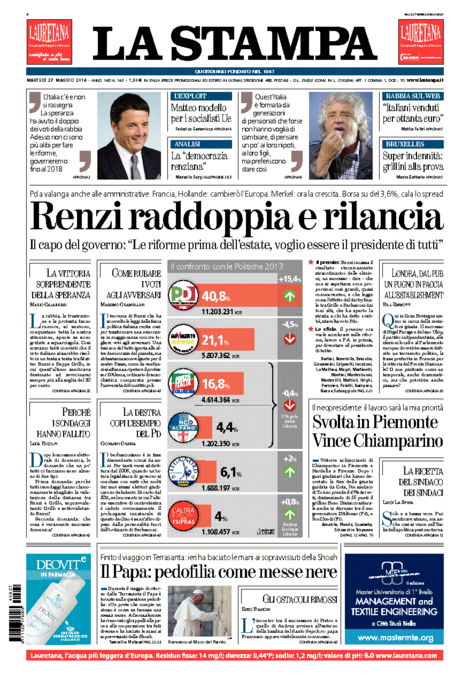 La Dc durò 40 anni, Berlusconi 20. Quanto durerà Renzi, o meglio l’innamoramento di una certa Italia per lui, dipende solo da lui (la distanza fra palazzo Venezia e piazzale Loreto è molto più breve di un tempo). Il suo governo – nato dall’accrocco fra un Pd al 25 %, un Centro montiano uscito dalle urne un anno fa col 9 e un Nuovo Centro Destra dato dai sondaggi al 6-7 – ora è un monocolore pidino, anzi renzino, che s’è mangiato gli alleati. Ma che dovrà seguitare a fare i conti con un Parlamento che non rappresenta più le vere forze in campo e con una maggioranza votata domenica da appena il 27 % degli elettori aventi diritto al voto. I partner ufficiali Alfano, Casini e Monti, per non estinguersi alle prossime urne, dovranno marcare le distanze dalle cosiddette “riforme”, Italicum e nuovo Senato, peraltro pessime. Così paradossalmente il Pd al massimo storico dovrà chiedere aiuto a un Berlusconi al minimo storico. E sappiamo bene che il soccorso azzurro non è mai gratis. In questa crepa potrebbe infilarsi il M 5 S, se si decidesse a una seria autocritica dopo la batosta (prendersela con i pensionati allergici al cambiamento fa ridere). Non per ammorbidire la sua opposizione intransigente, che è ciò che chiedono i suoi 5, 8 milioni di elettori rimasti. Ma per cambiare linguaggio e strategia. Il linguaggio che paga non è quello provocatorio e paradossale di Grillo (che, tradotto sui titoli di tg e giornali, diventa serio e truculento, spaventa la gente e non basta un’ospitata a Porta a Porta per cancellarne gli effetti), ma quello dei suoi parlamentari migliori (più concreto sulle cose fatte e quelle da fare), e anche quello autoironico del video di ieri. Quanto alla strategia, il “mandiamoli tutti a casa” funzionava contro D’Alema, Bersani, Letta jr. e gli altri brontosauri. Contro Renzi no, non basta. Renzi va sfidato e incalzato sui fatti. Anche perché domenica ha risolto tutti i suoi problemi, non certo quelli degli italiani. Quando, intervistato dal Fatto il 2 gennaio, invitò i 5 Stelle al tavolo delle riforme, offrendo la rinuncia ai rimborsi elettorali, fu demenziale rispondere picche e non andare a vedere le carte, magari per smascherare l’eventuale bluff. E quando il mitico “popolo della Rete” costrinse Grillo ad accettare l’incontro in streaming con lui, non si aspettava certo il rifiuto totale di ascoltare e di rispondere, anche duramente, ma sul merito.