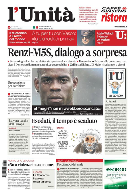 Italia proletaria e renzista, in piedi! “L’Italia ha un vantaggio sull’Uruguay e su un’altra decina di squadreediPaesi: neimomentidifficiliècapacedi reazioni impreviste. Non ha il passo lungo della costanza e del metodo… Ma talora ha avuto, non solo nel calcio, uno scatto che l’ha portata a superare ostacoli più impervi anche della coppia Suarez-Cavani… Pure nel calcio ci sono segni che qualcosa nella coscienza del Paese è cambiata (sic, ndr). Oggi l’inno lo cantano pure i calciatori di origine argentina come Paletta o brasiliana come Motta. Se i simboli sono importanti, oggi l’Italia ha più consapevolezza di se stessa anche nel calcio” (Aldo Cazzullo, “Orgoglio e giudizio”, Corriere della Sera, 24-6).