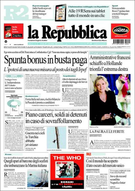 La prima pagina de La Repubblica: “Spunta bonus in busta paga”.