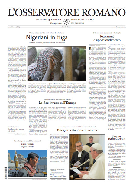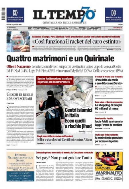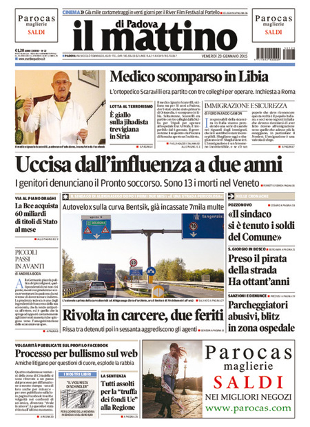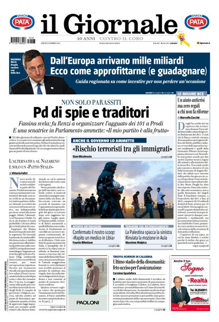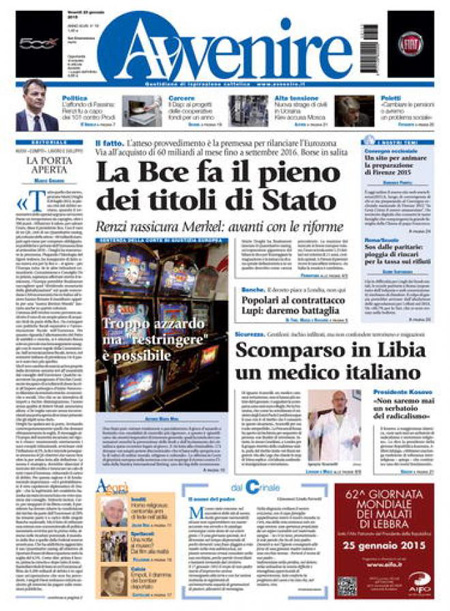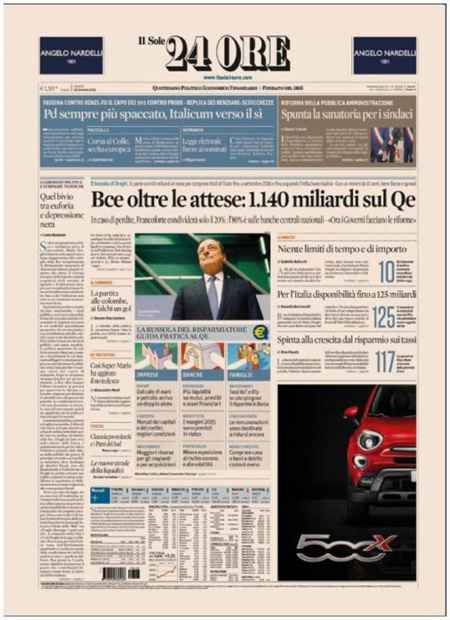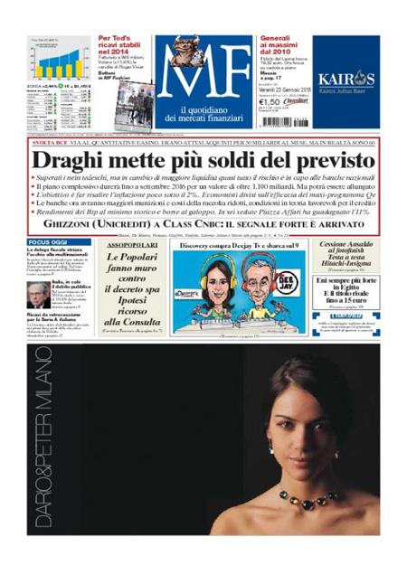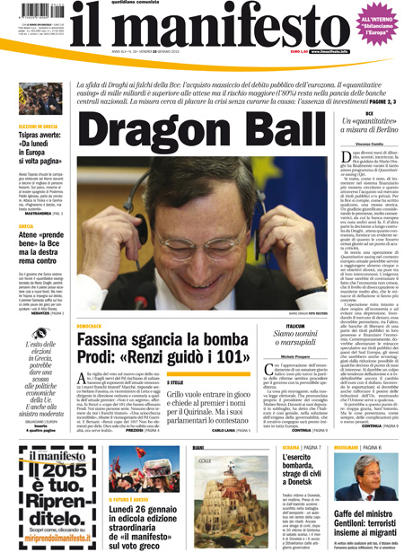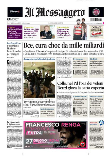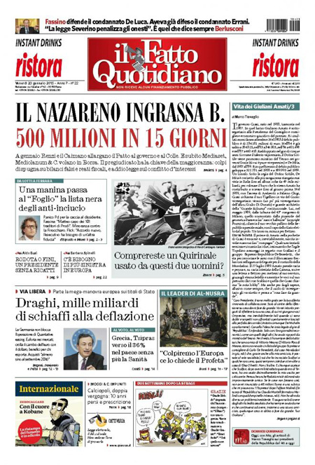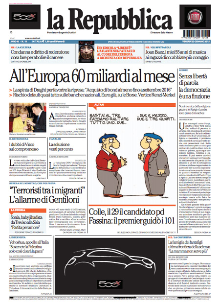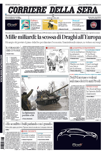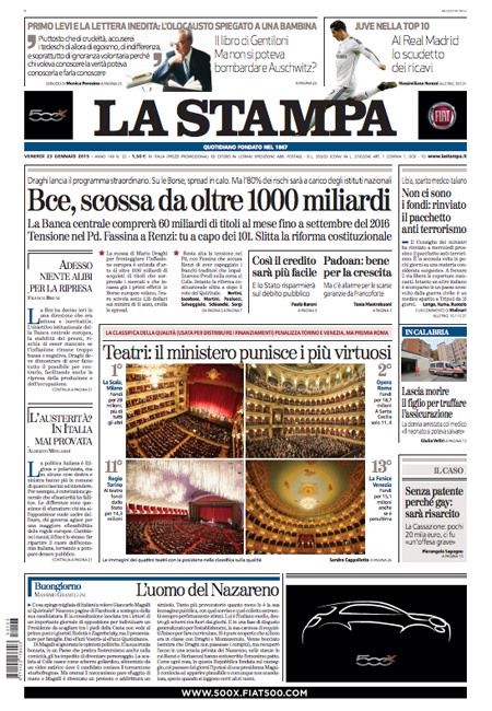 ROMA – Le prime pagine dei giornali di venerdì 23 gennaio. La Stampa: “Bce, scossa da oltre 1000 miliardi”. Il Corriere della Sera: “Mille miliardi: la scossa di Draghi all’Europa”. La Repubblica: “All’Europa 60 miliardi al mese”. Il Sole 24 Ore: “Bce oltre le attese: 1.140 miliardi sul Qe”. Il Messaggero: “Bce, cura choc da mille miliardi”. Il Giornale: “Non solo parassiti. Pd di spie e traditori”. Il Fatto Quotidiano: “Il Nazareno ingrassa B. 500 milioni in 15 giorni”. Libero: “Paghiamo Sky ai clandestini”.