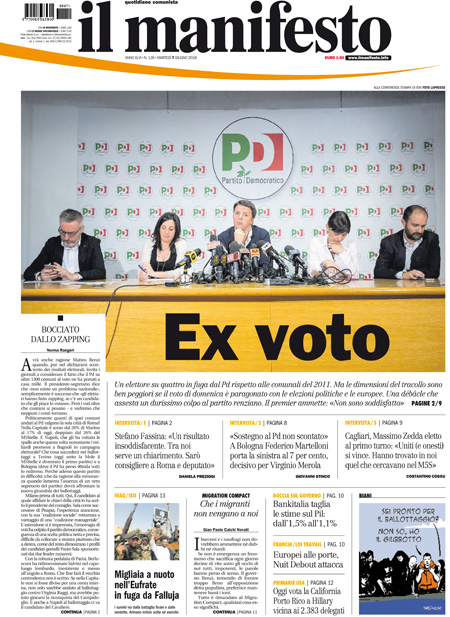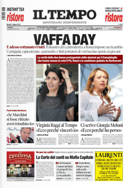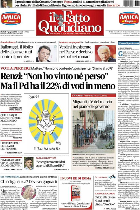 La prima pagina di Libero: “Politica coi tacchi a spillo. Comandano le donne”. La prima pagina del Fatto Quotidiano: “Renzi: non ho vinto nรฉ perso. Ma il Pd ha il 22% di voti in meno”. La prima pagina del Tempo: “Vaffa day”.ย Queste le prime pagine di martedรฌ 7 giugno.
