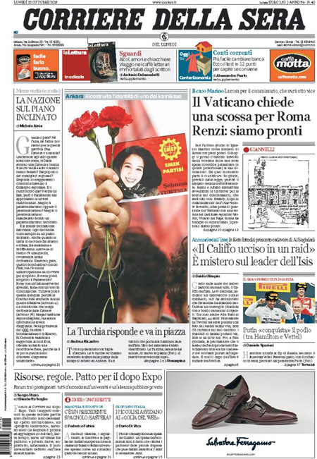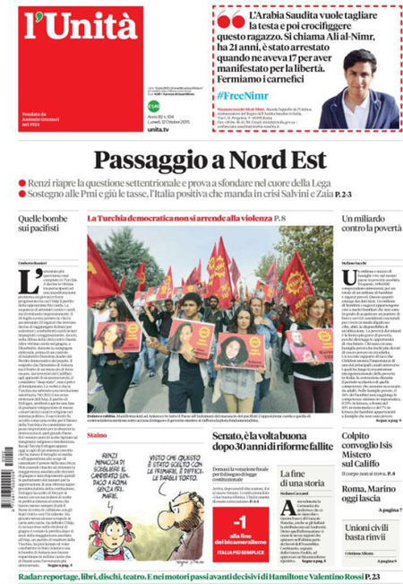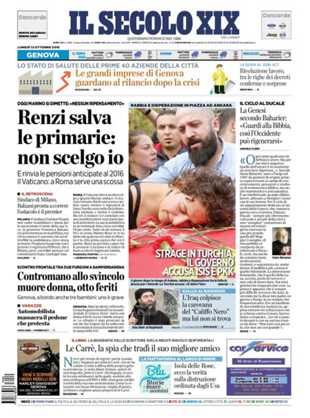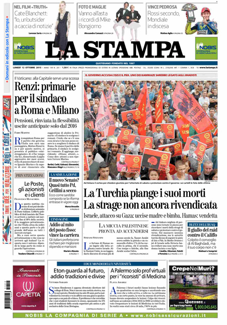 ROMA – Le cene di Matteo Renzi, Ignazio Marino e la strage in Turchia: questi gli argomenti principali sule prime pagine dei giornali di lunedì 12 ottobre. Apre con le ultime dichiarazioni del premier e sulle prossime elezioni comunali a Roma e Milano il quotidiano torinese La Stampa: “Renzi: primarie per il sindaco a Roma e Milano”. La reazione del Vaticano dopo le dimissioni di Marino nella prima pagina de Il Corriere della Sera: “Il Vaticano chiede una scossa per Roma”. Invece La Repubblica apre con la strage di Ankara e con le manifestazioni curde contro il premier Erdogan: “La Turchia contro Erdogan”.