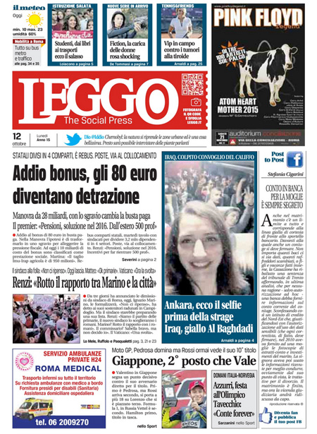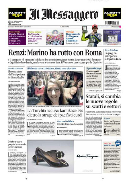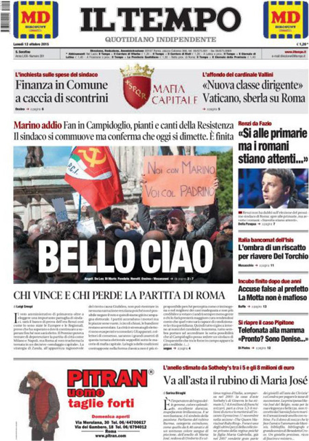 Apre su Roma e sulle dimissioni di Marino anche Il Messaggero: “Renzi: Marino ha rotto con Roma”. Stesso argomento sulla prima pagine de Il Giornale: “Marino lascia e raddoppia”. Stesso argomento sull’altro quotidiano romano, Il Tempo: “Bello ciao”. Apertura diversa per il free press Leggo: “Addio bonus, gli 80 euro diventano detrazione”. Questa la gallery con tute le prime pagine di lunedì 12 ottobre.